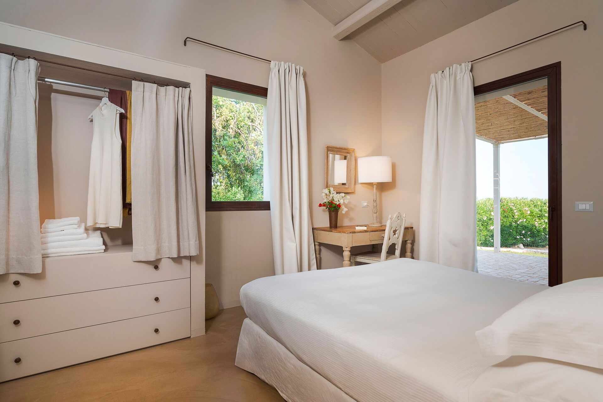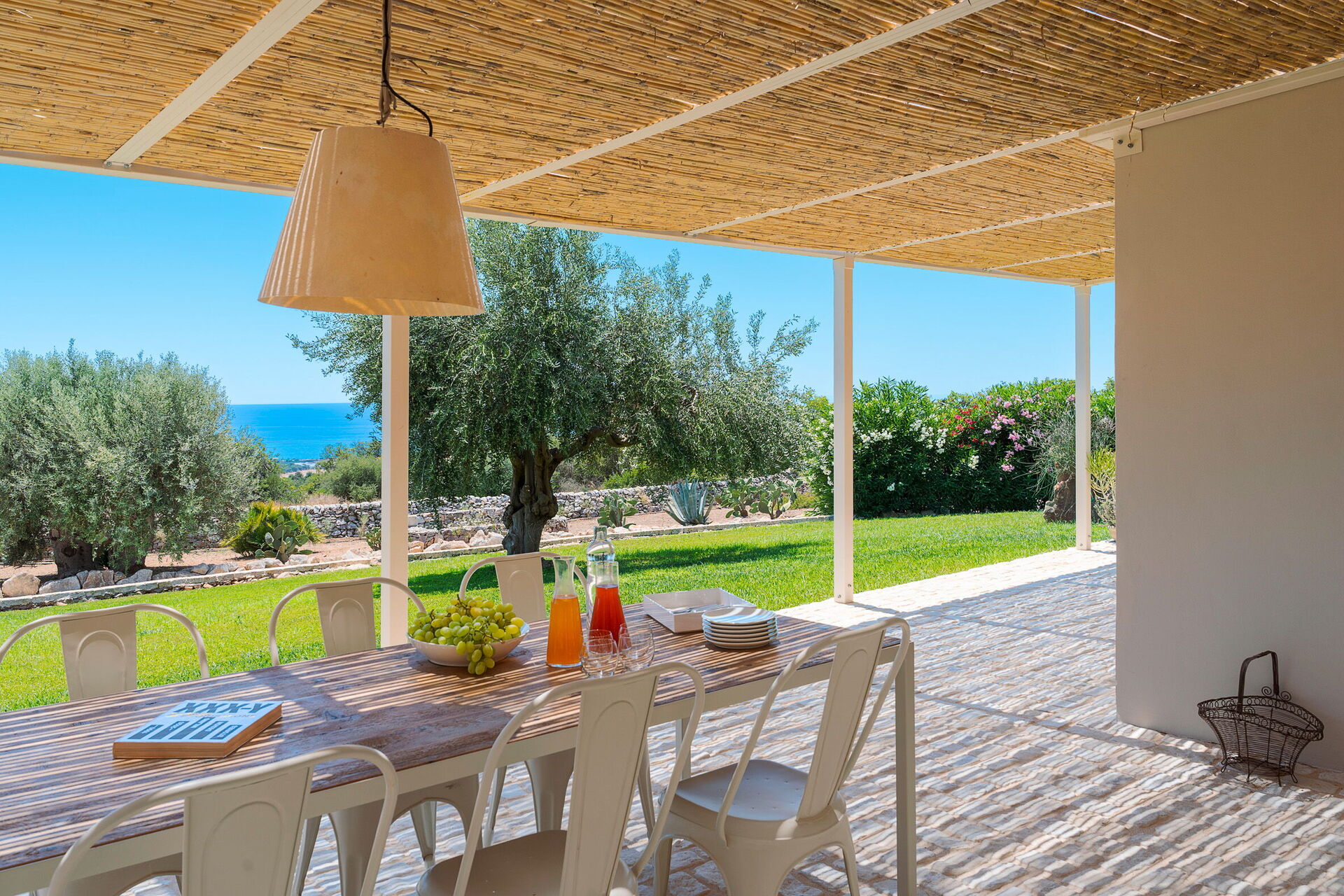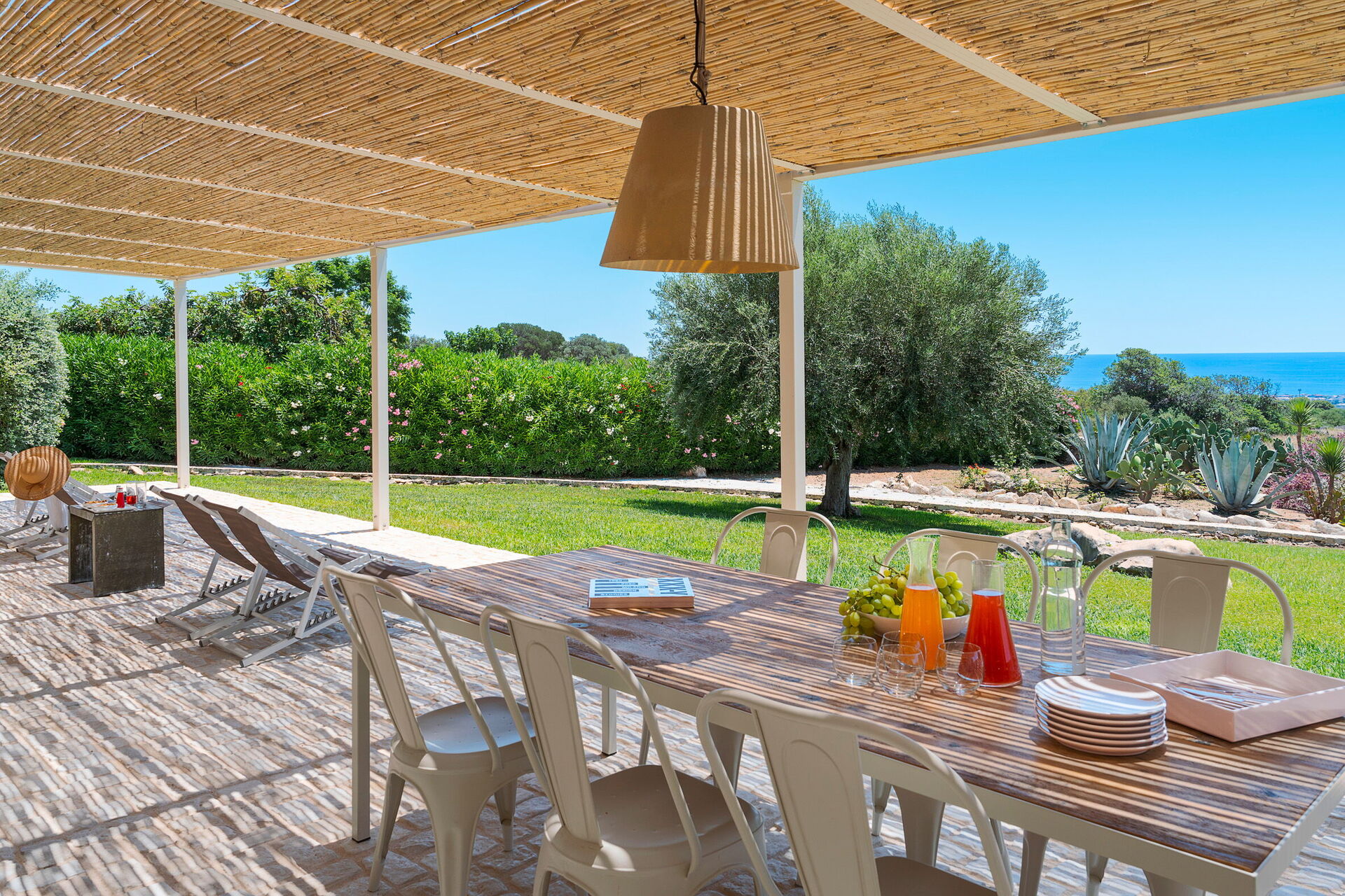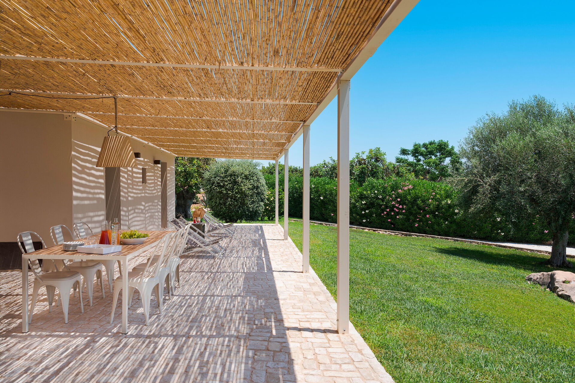 Aussenbereich: Terrasse mit Pergola, Garten, Gemeinschaftsschwimmbad.