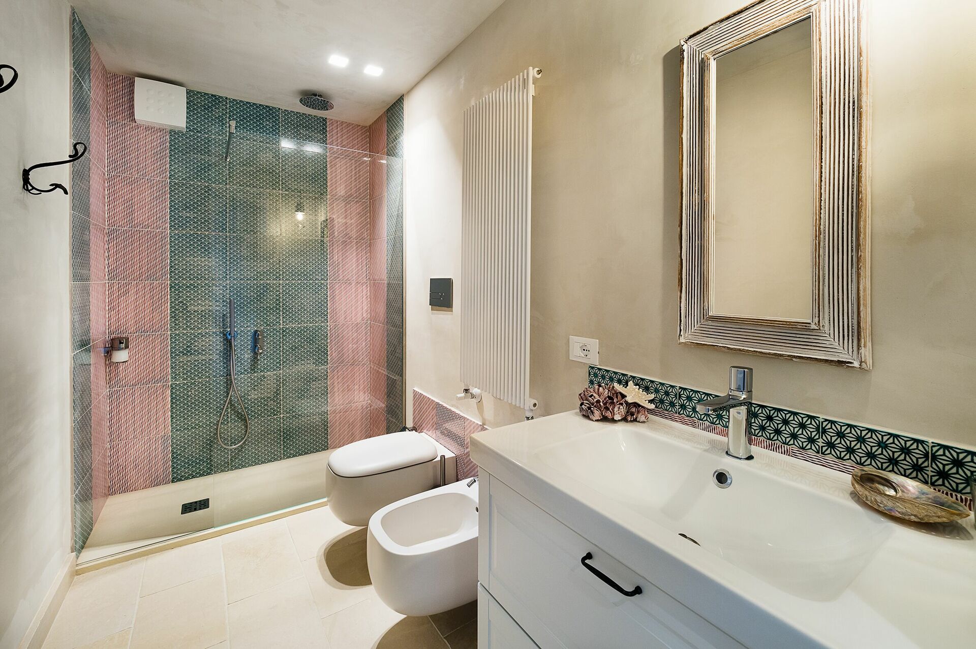 Erdgeschoss:Wohnzimmer mit Kamin, Essbereich und Küche, 1 Gäste WC, 2 Doppelzimmer jeweils mit Bad mit Dusche, 1 Doppelzimmer mit Zugang zu dem Zwischenstockwerk mit 2 Einzelbetten und Bad mit Dusche, 2 Doppelzimmer mit Zugang nur von aussen, jeweils mit privatem Bad mit Dusche.