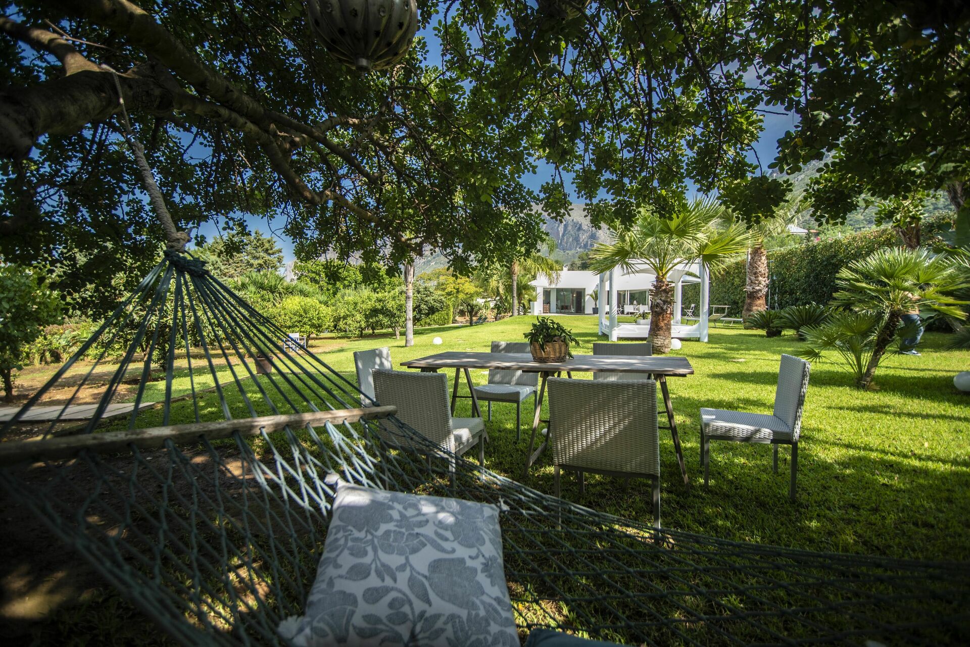 In einem Bereich des Gartens, der mit mediterranen Pflanzen bewachsen ist, befindet sich ein ausgestatteter Platz um draussen Essen zu können mit Barbecue.