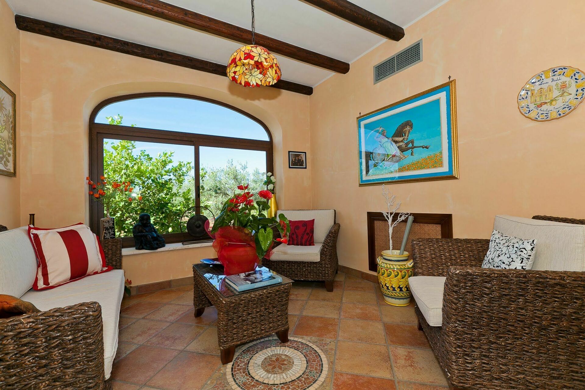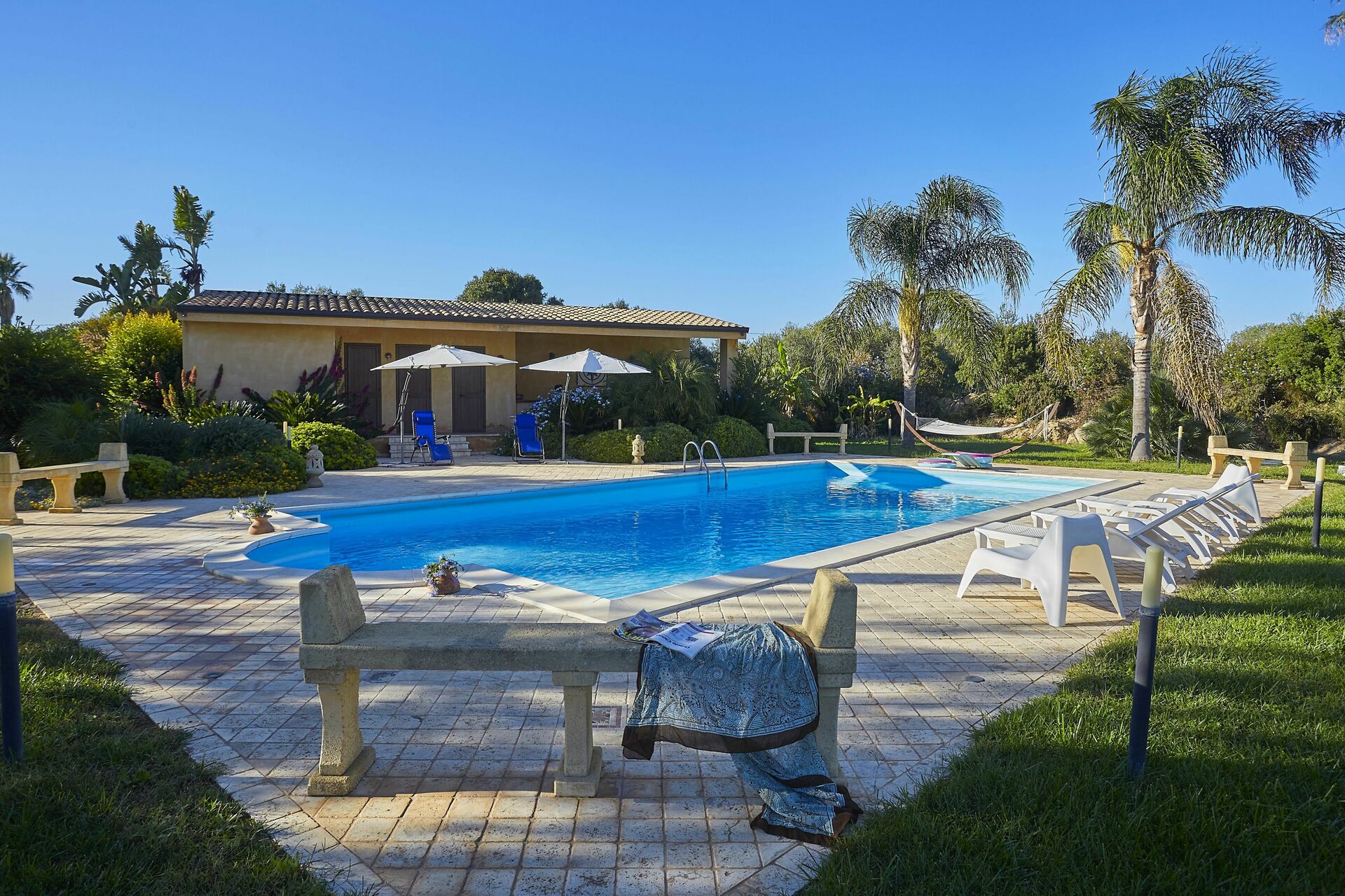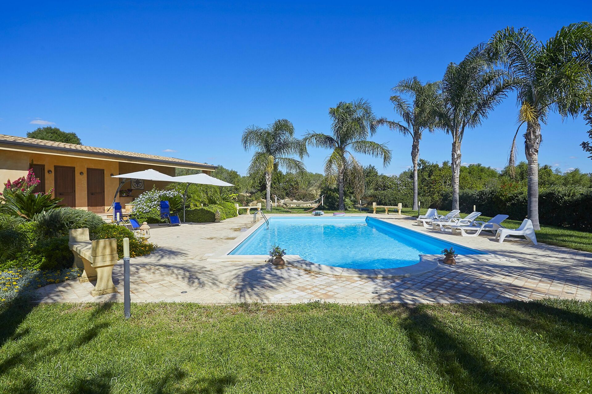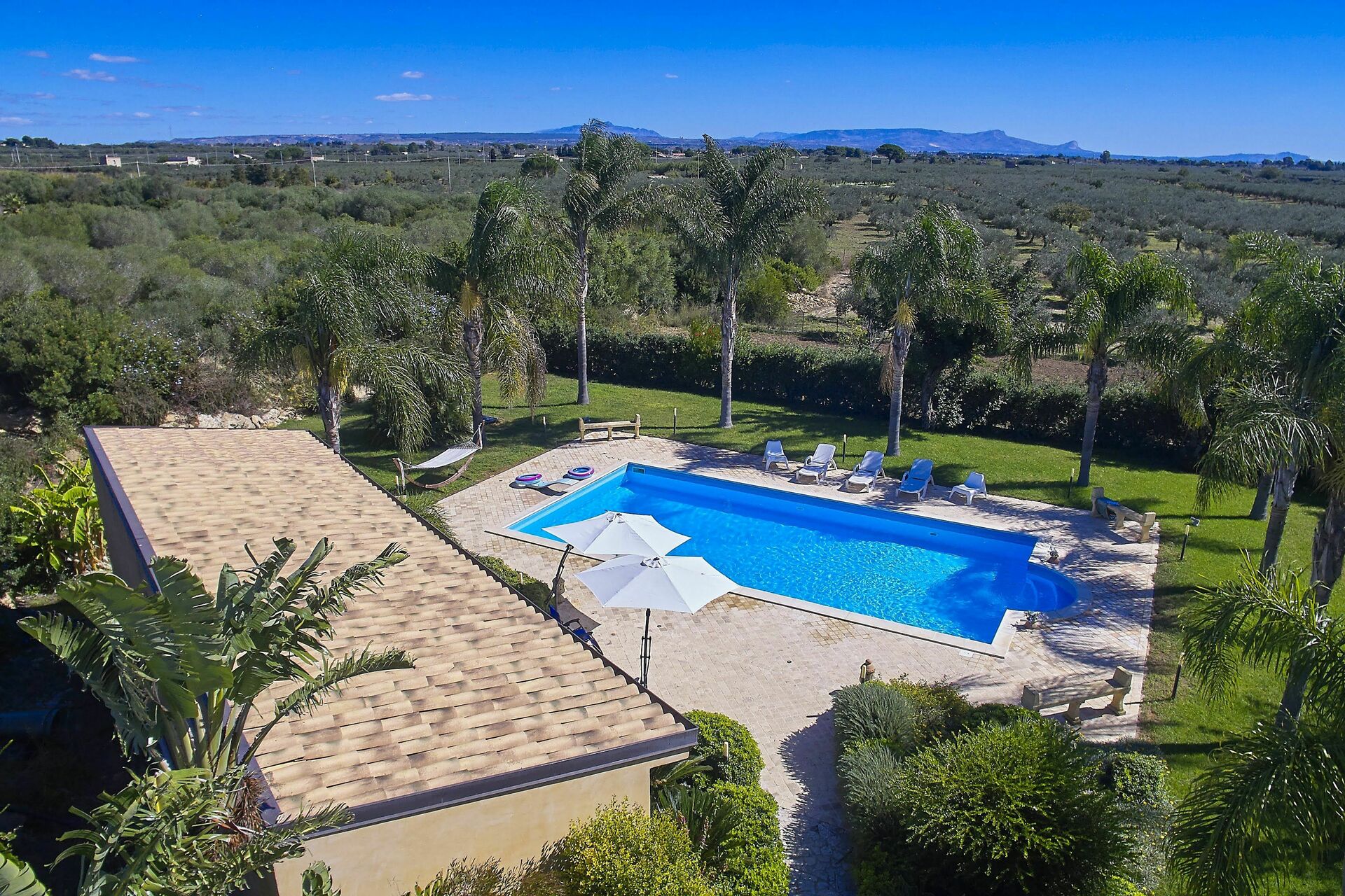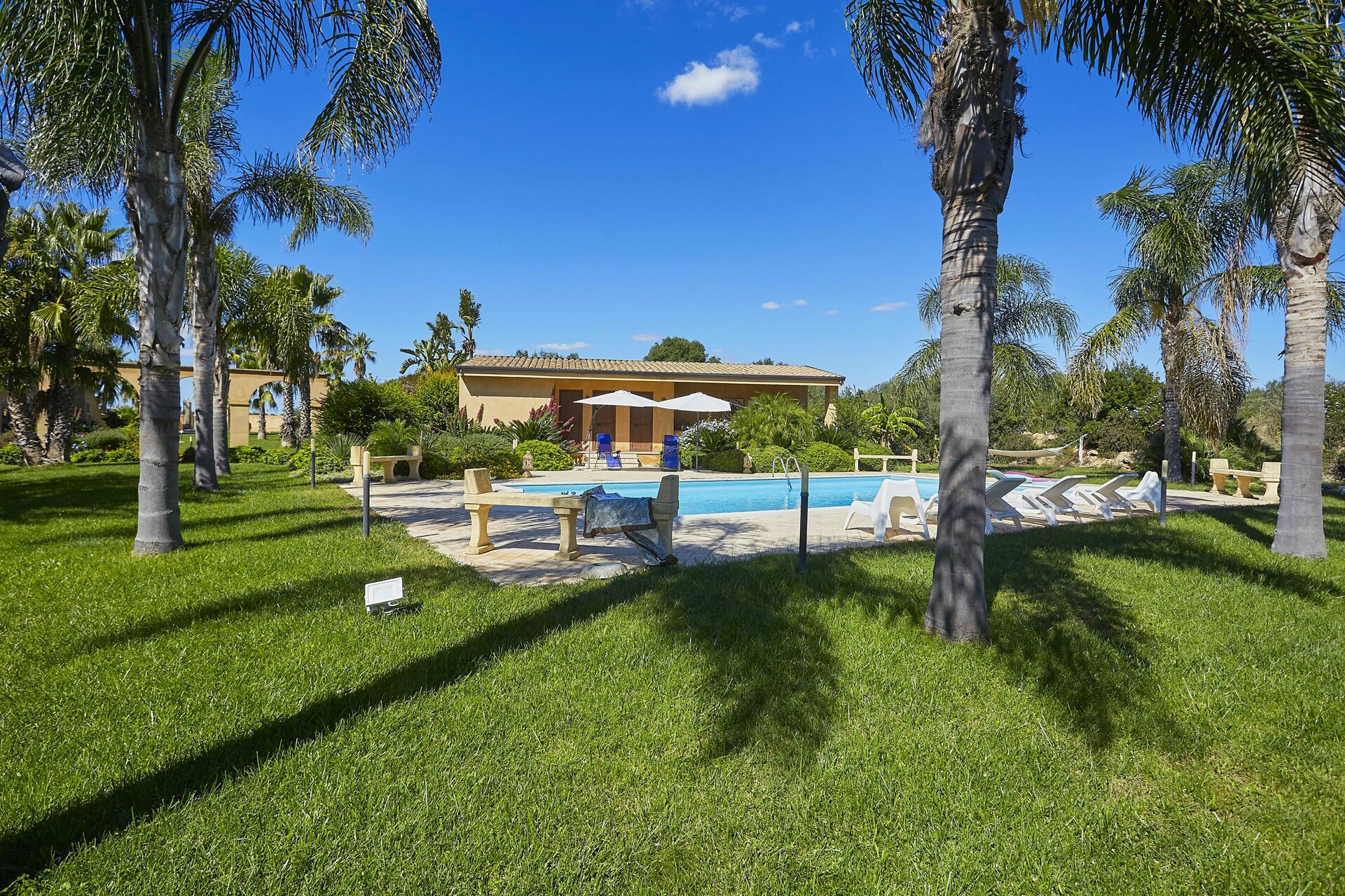 Die Villa erstreckt sich auf 2 Etagen und ist mit Sorgfalt und Geschmack eingerichtet.Die Villa ist von einer üppigen Vegetation umgeben und in dem grossen Park befindet sich ein Schwimmbad mit einem Nebengebäude mit Bad und Dusche.In dem grossen Garten gibt es ausserdem eine Terrasse mit Küche,Grill und einem Tisch aus kostbarem sizilianischem Majolika um den Gästen unvergessliche Abendessen im freien bieten zu können.Der Grund, auf dem sich der Besitz befindet ,besteht aus 14.000m2 Land,und ist teilweise bebaut mit Oliven,Wein und Obstbäumen.