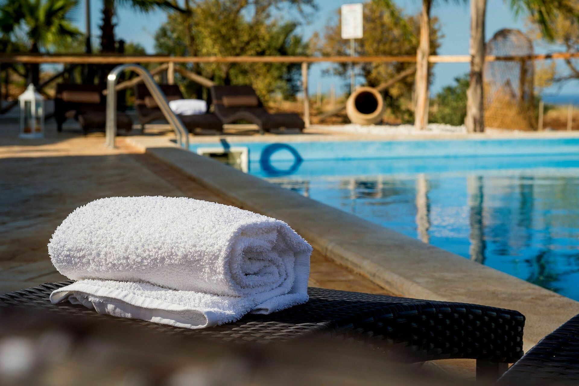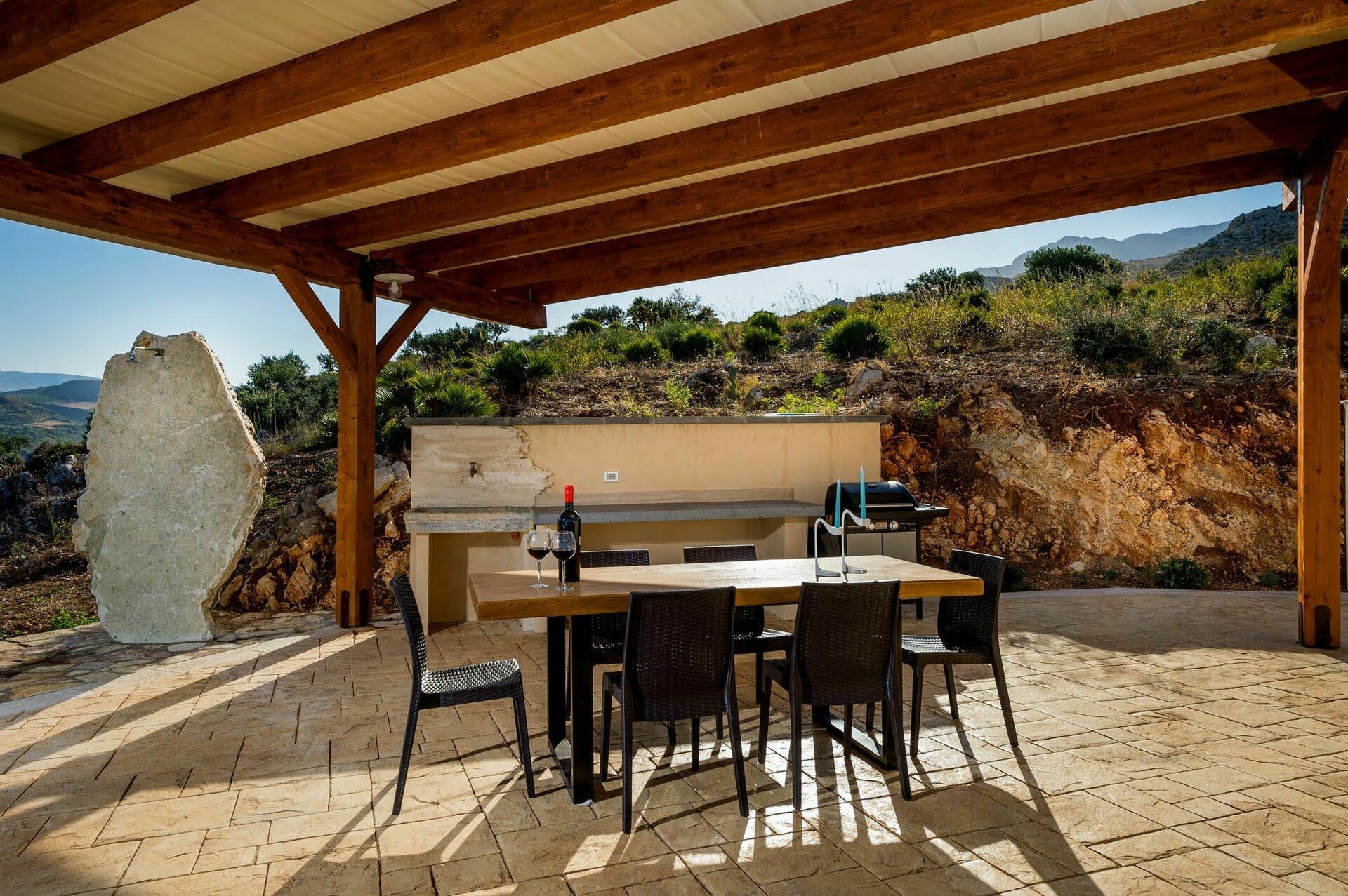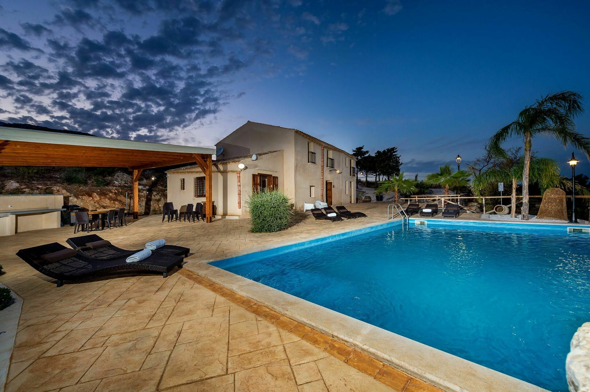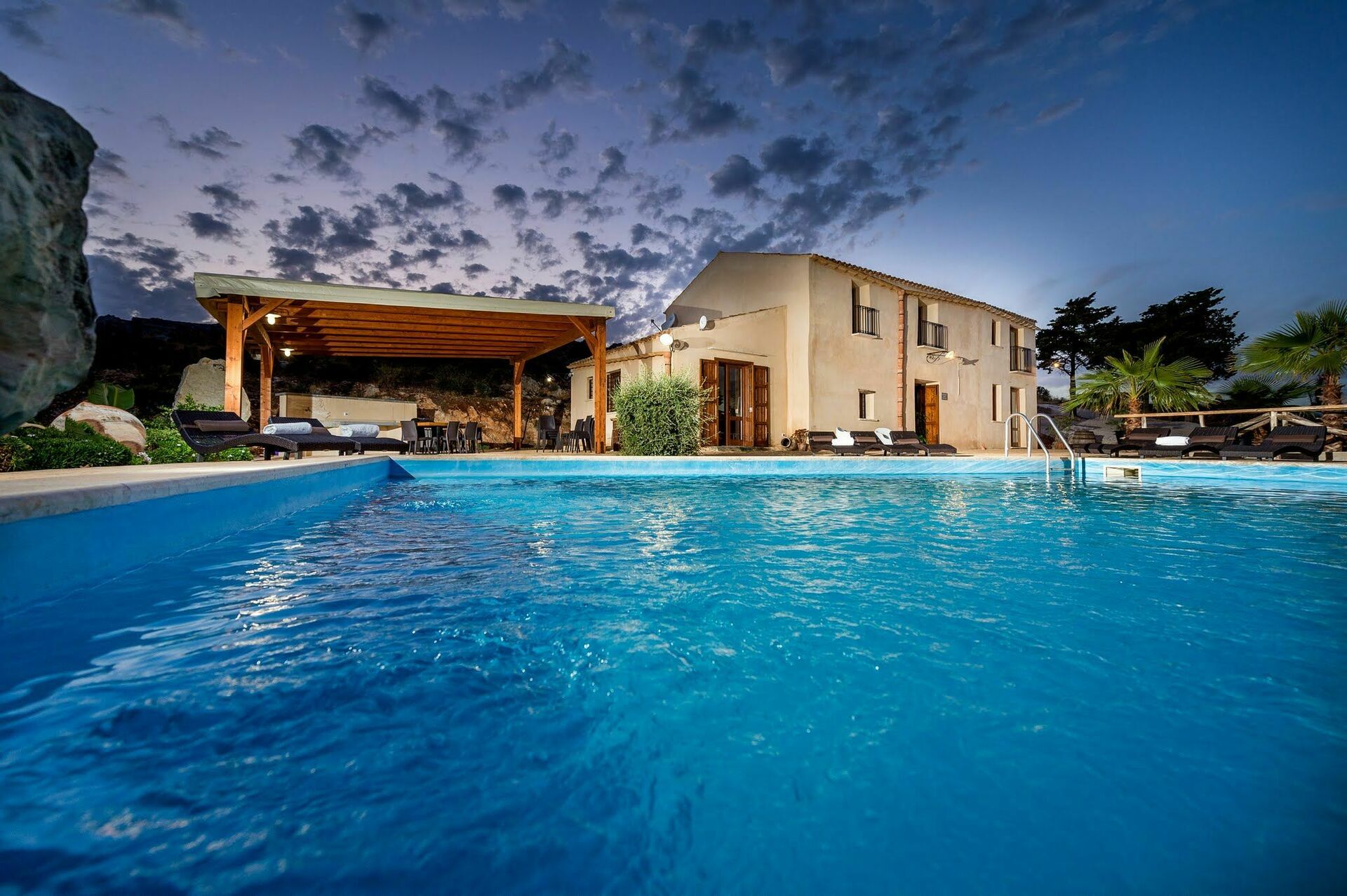 Der Besitz mit eigener Zufahrtsstrasse, verfügt über einen grossen, natürlichen Garten, zwischen milchweissen Steinen und einem sehr schönen, beleuchtetem Schwimmbad, mit Dusche, Liegestühlen und Sonnenschirmen. Auf dem Besitz gibt es mehrere Plätze an denen man ausruhen kann und die ausgestattet sind mit Tischen und Stühlen um draussen Essen zu können. Auf dem Platz vor dem Haus steht den Gästen ein Barbecue zur Verfügung.