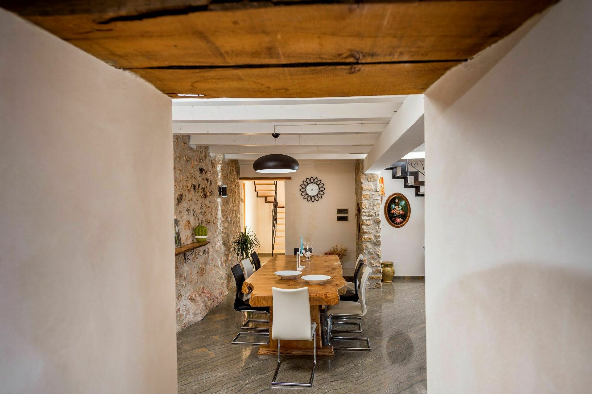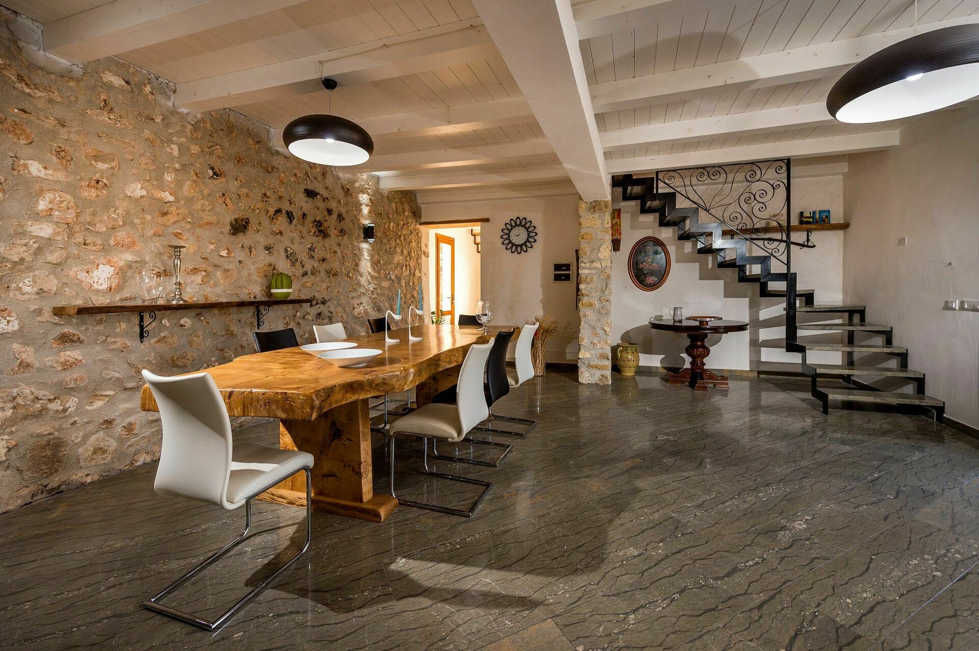 Erdgeschoss:Tagesbereich bestehend aus grossem Wohnzimmer mit Zugang nach draussen zum Garten, grosser Essbereich, grosse, gut ausgestattete Küche mit Abstellkammer, Bad, Schlafzimmer mit Ehebett und Einzelbett (auf Anfrage). Das Zimmer verfügt über Klimaanlage, TV und Zugang zum Garten.