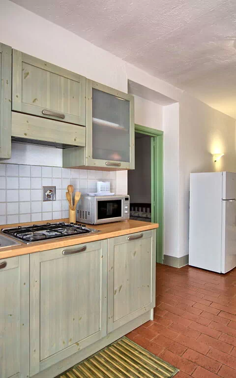 kleine Küche (TV, Kühlschrank, Herd, Mikrowelle) mit Esstisch, Doppelzimmer (Klimaanlage) mit Zugang zur Terrasse und eigenem Bad mit Dusche.