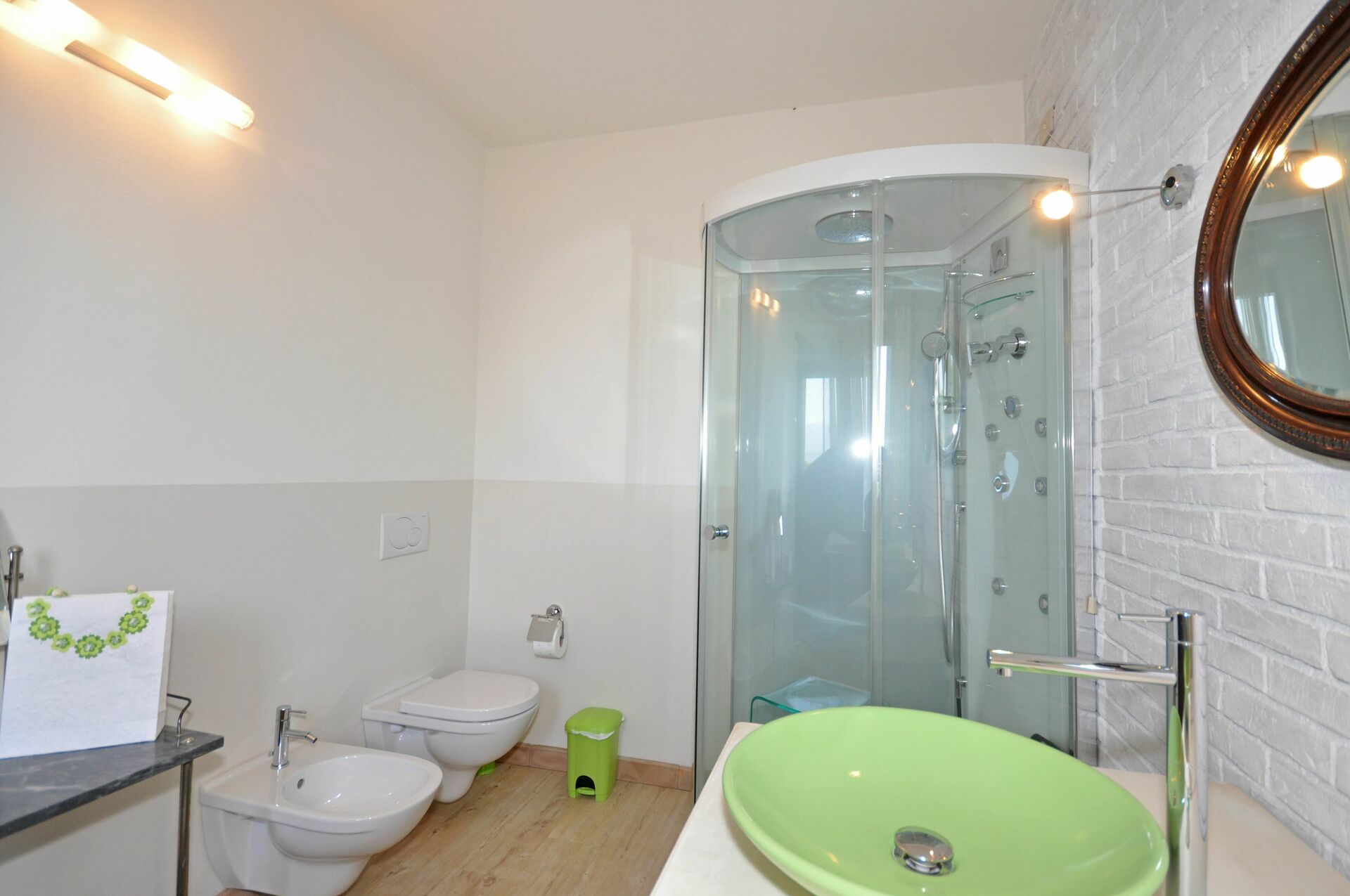 Erdgeschoss Doppelzimmer mit Ehebett und privatem Bad mit Dusche (ohne Fenster). Dieses Zimmer ist nur von außen erreichbar. Waschküche mit Waschmaschine, Bügelbrett und Bügeleisen.