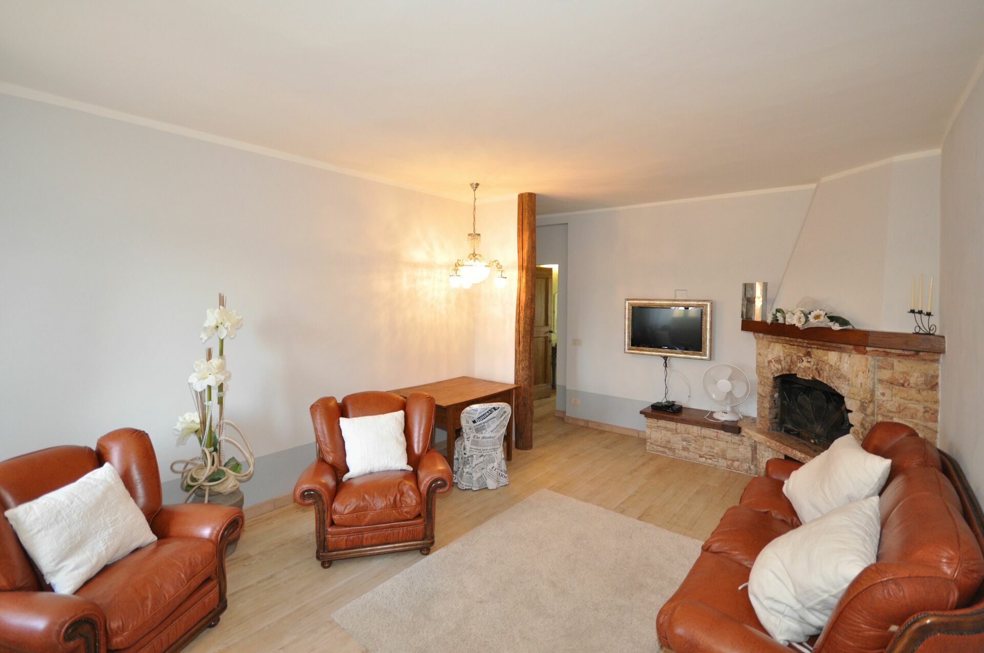 Erster Stock: Eingang zum Wohnzimmer, Küche (Ofen, Tiefkühlfach, Spülmaschine, amerikanische Kaffeemaschine, Toaster), Wohnzimmer (Satelliten-TV) mit Kamin, 2 Doppelzimmer mit Ehebett jeweils mit privatem Bad mit Dusche, Doppelzimmer mit Ehebett und privatem Bad mit Hydromassagedusche.