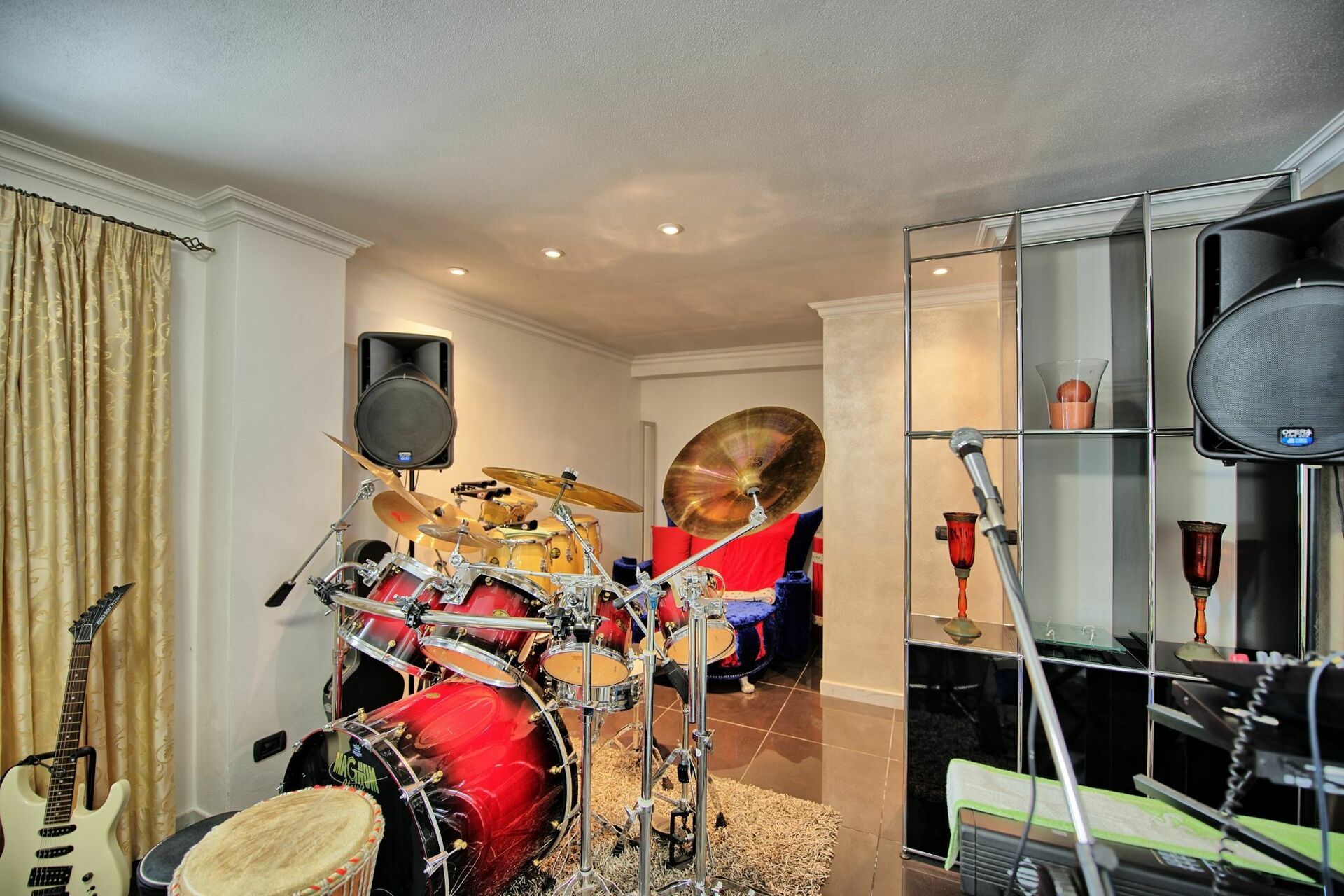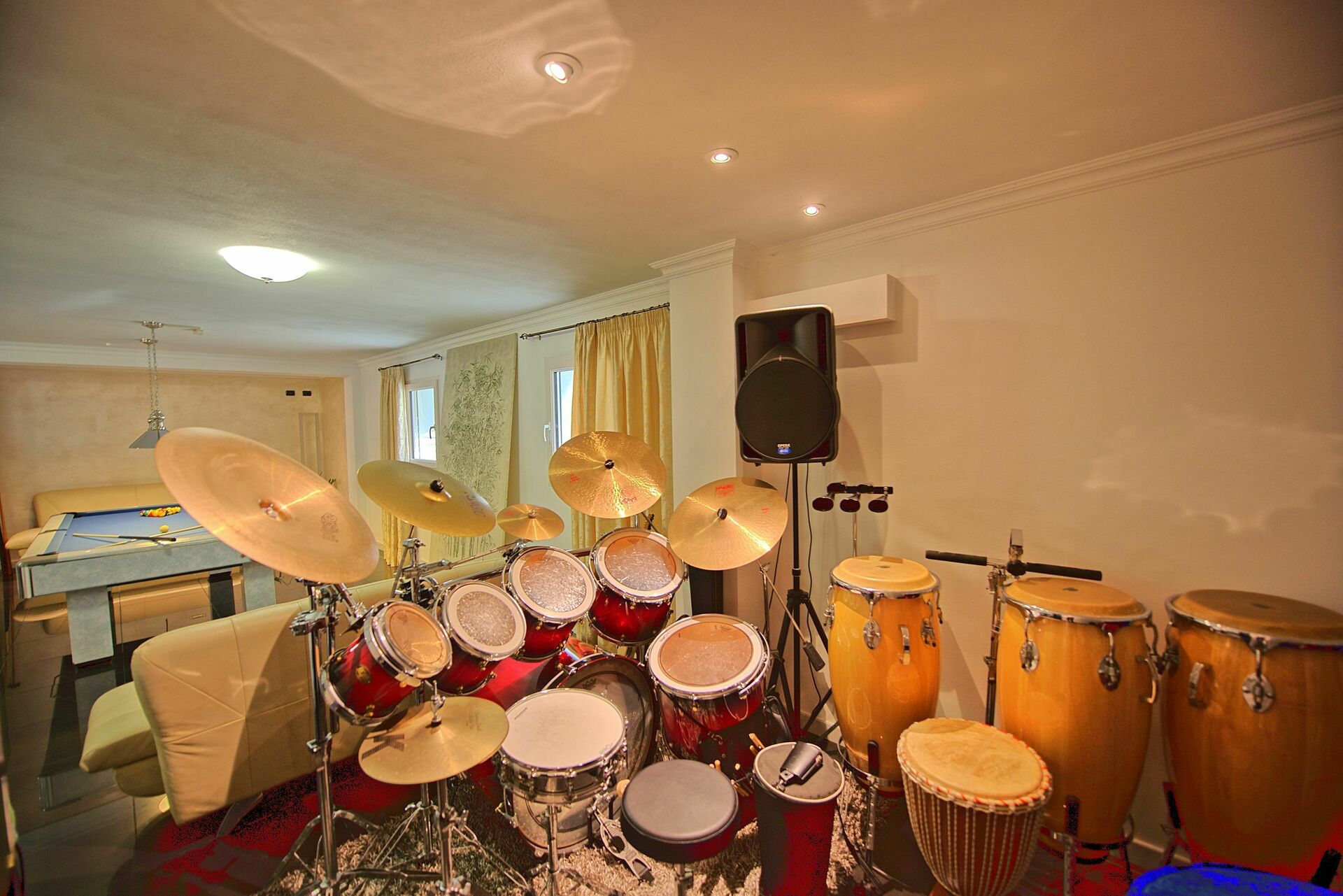 Auf einem grossen Bildschirm kann man Filme wie im Kino ansehen mit einem guten Stereosystem und in einem Übungsraum kann man sich mit einem Schlagzeug, Keyboard, Mikrofonen und einer Karaoke-Anlag amüsieren oder Tischfussball oder Billard spielen.