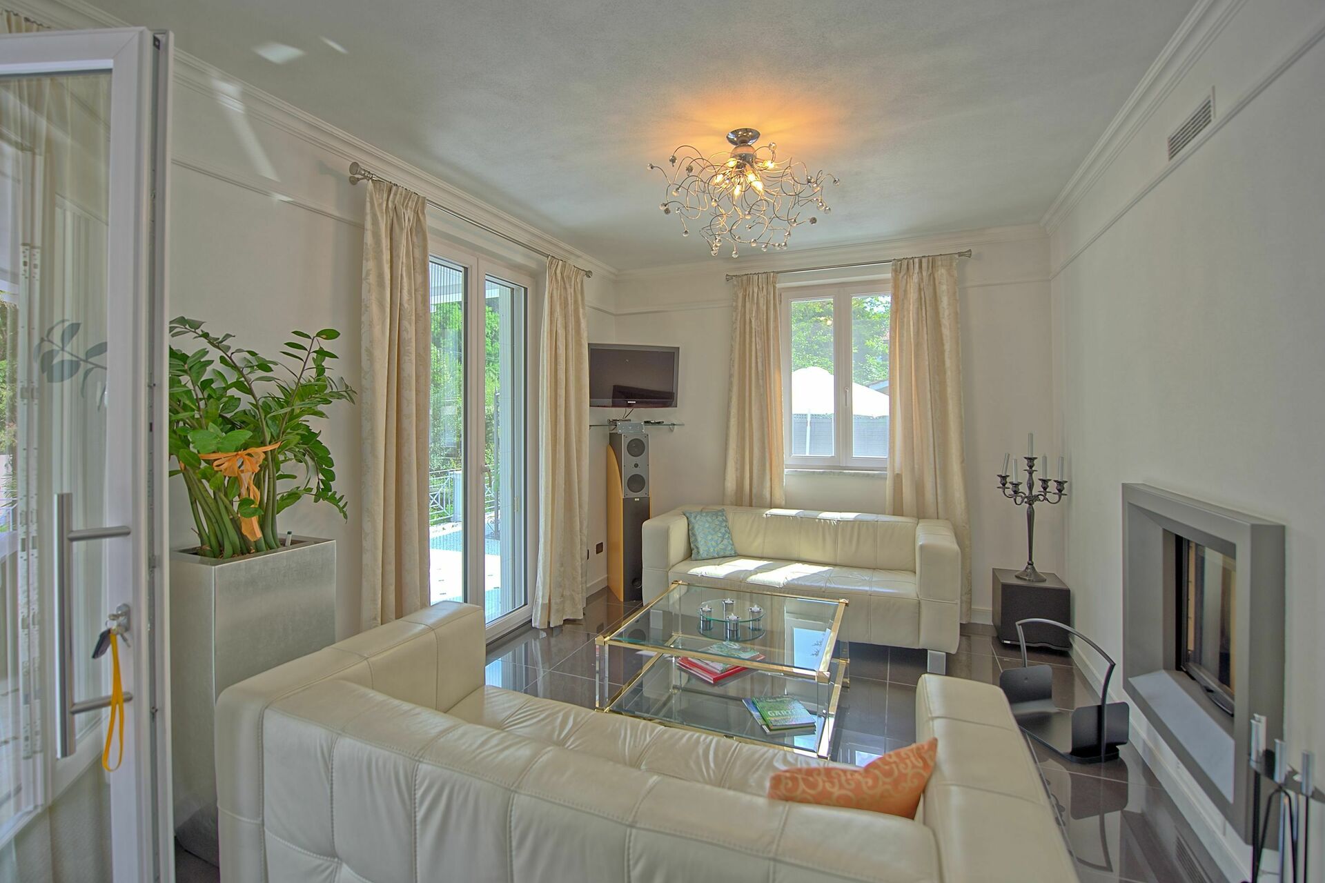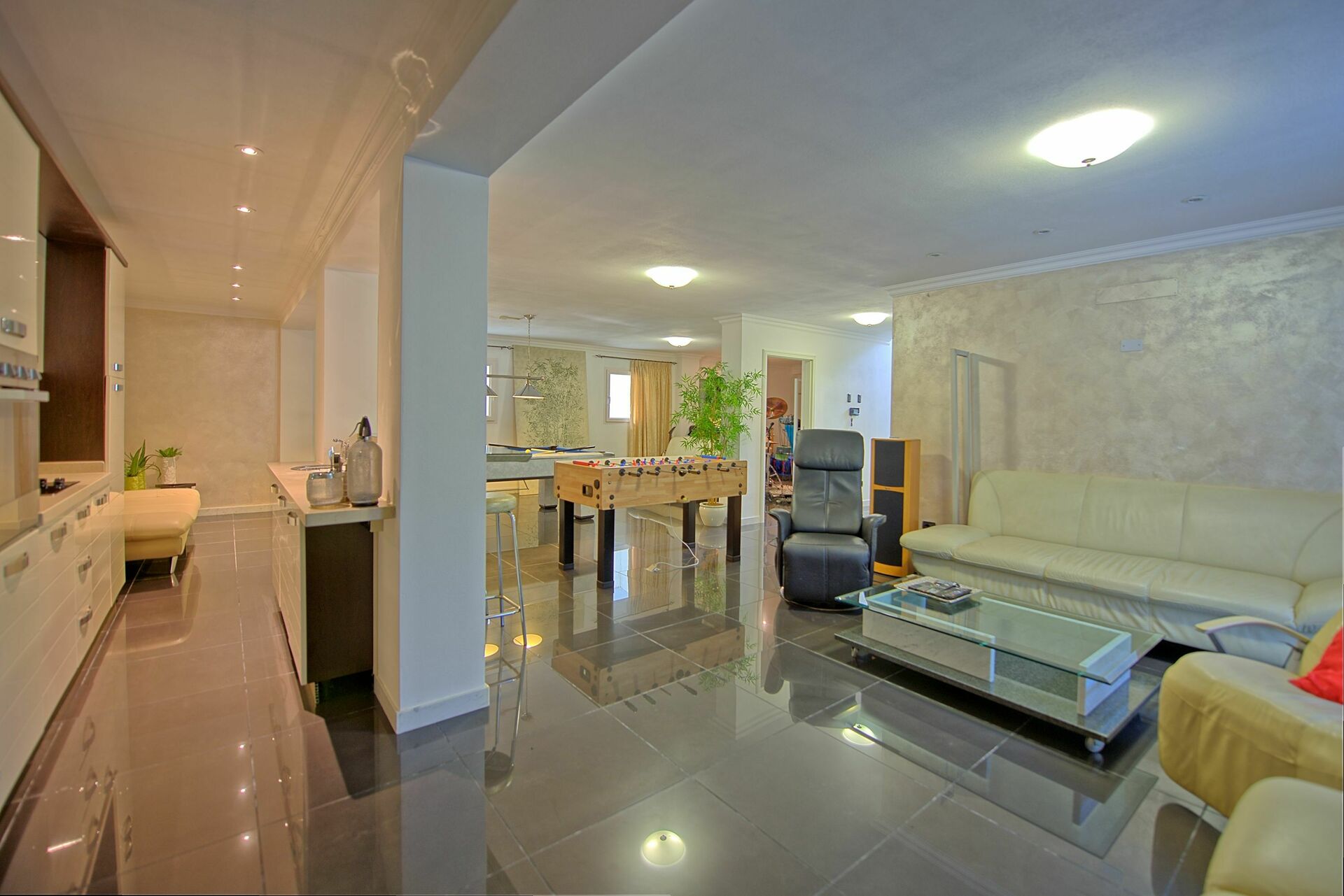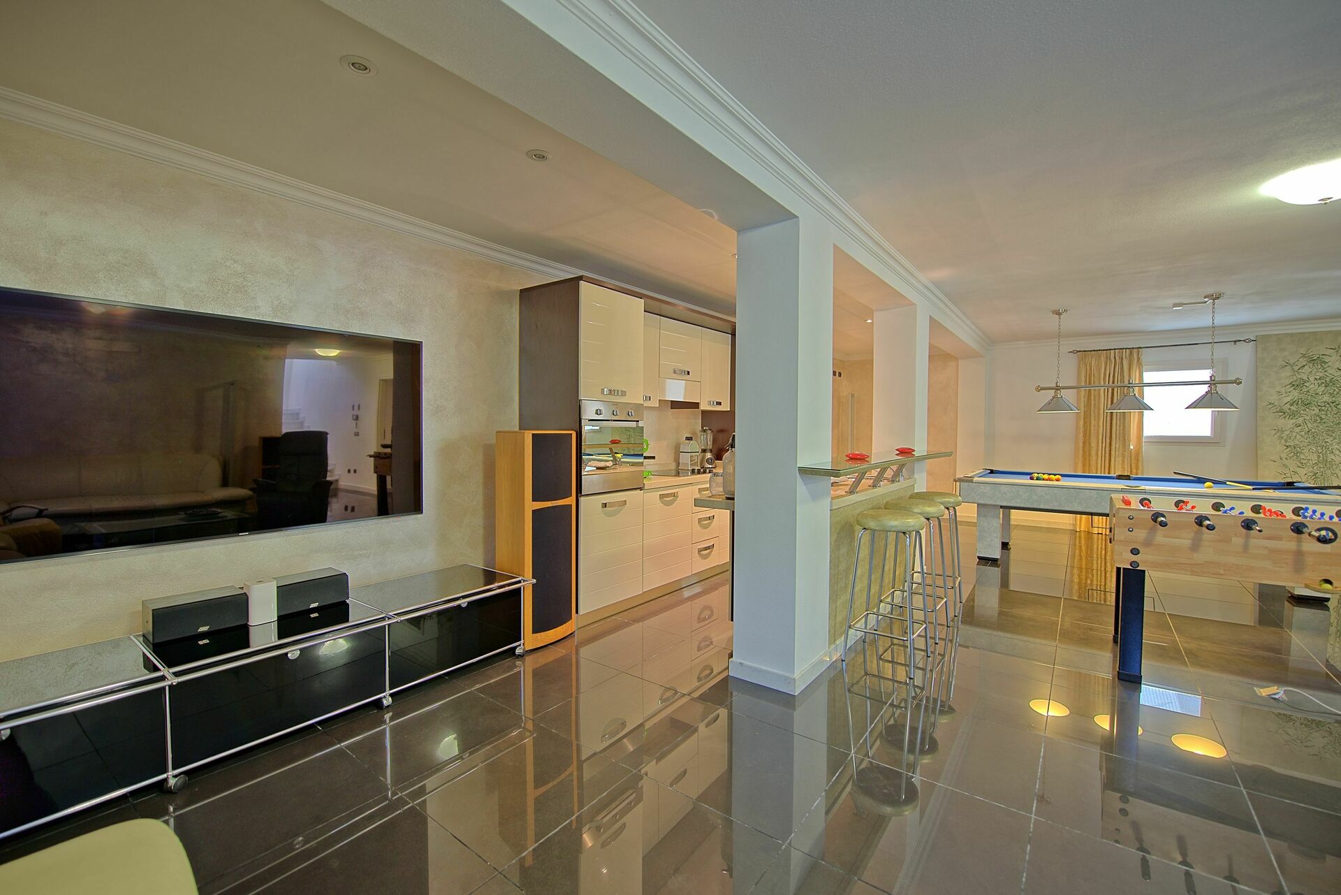 Es ist nicht nur sehr viel Wert auf die Ausstattung gelegt worden sondern auch auf die Ausstattung des multimedialen Bereiches: über bluetooth kann man mit dem Smartphone oder dem Tablet seine eigene Musik im ganzen Haus geniessen und ein ganzes Stockwerk ist nur für das Vergnügen der Gäste ausgestattet.