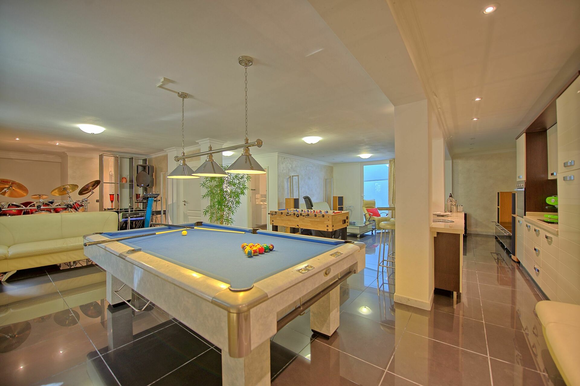 Untere Etage(auch von aussen zugänglich): Wohnbereich mit Küchenecke (Backofen, Gefrierschrank, Spülmaschine), Bereich mit cinema -dolby -surround -system, Tischfussball, Billardtisch, Musikinstrumente (Schlagzeug,Keyboard, Mikrofone), Waschküche (Waschmaschine, Trockner), Bad mit Dusche.