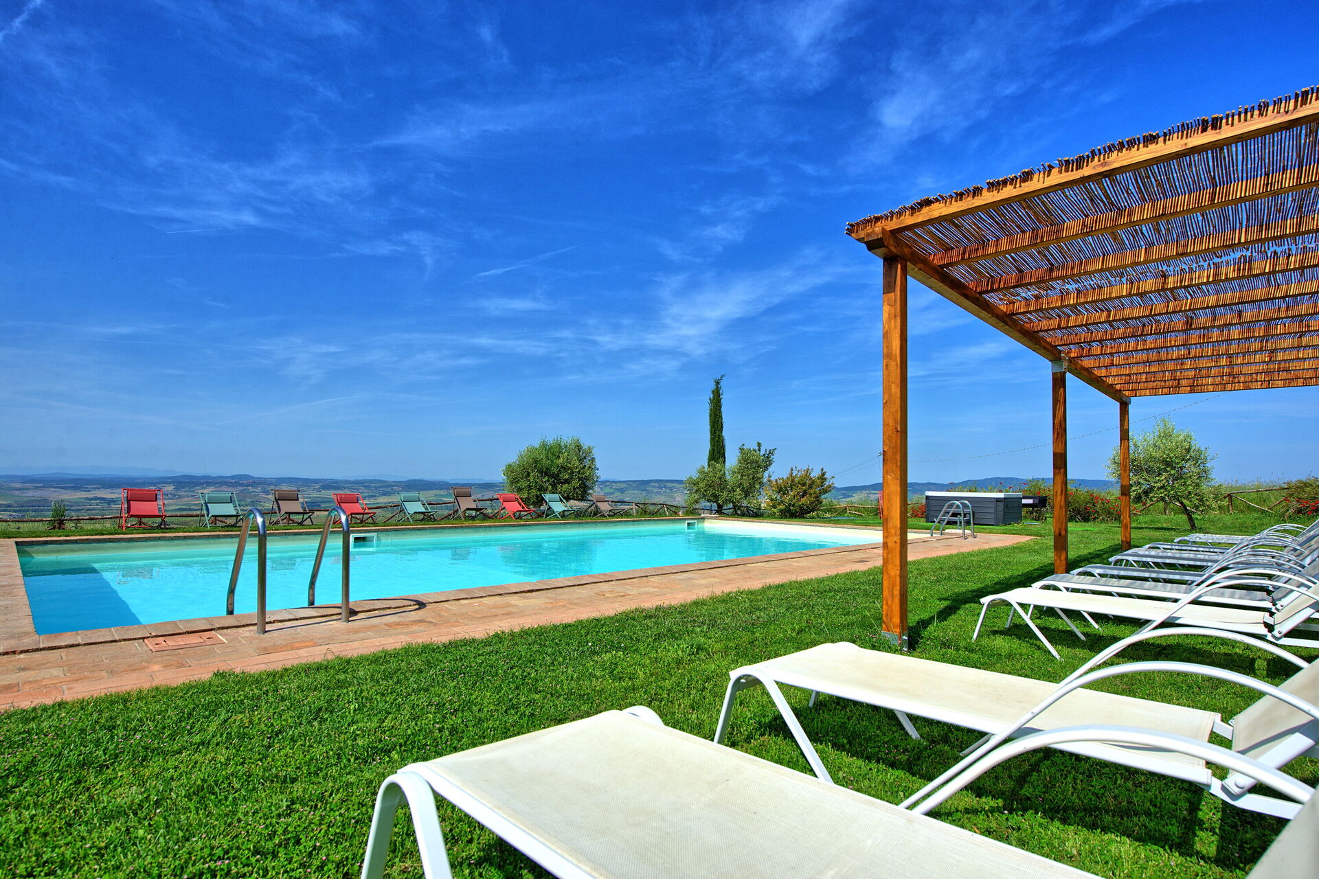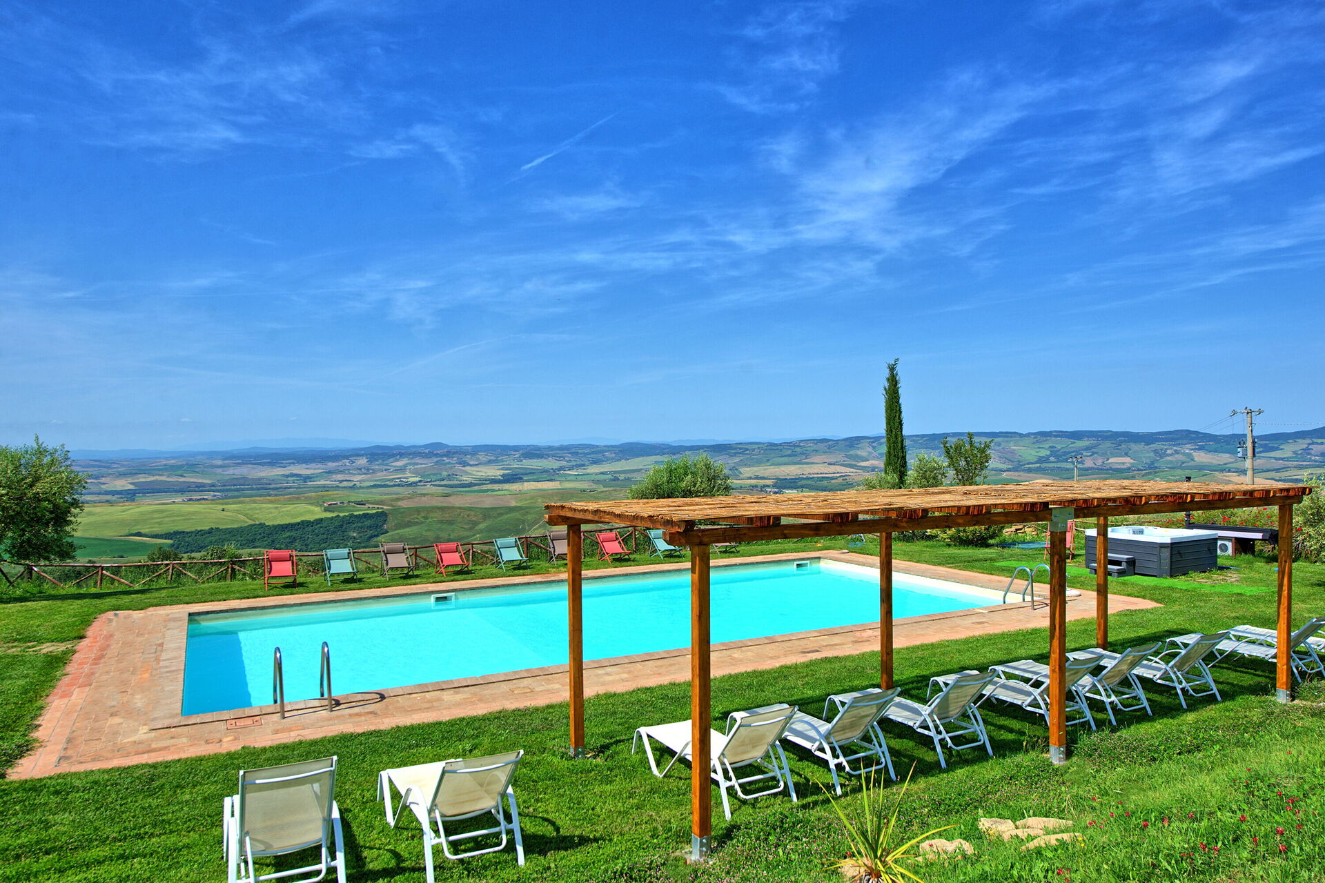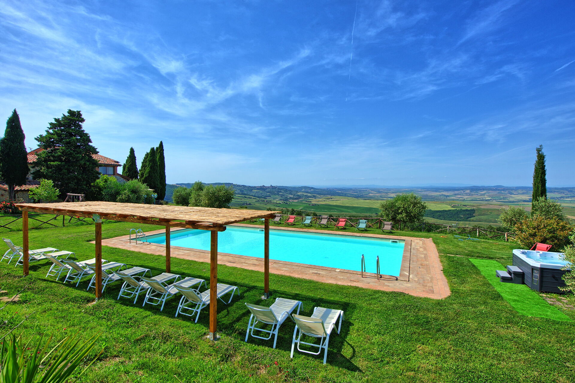 Ferienvilla mit privatem Schwimmbad und Whirlpool im Orcia Tal in der Toskana, umgeben von einem wunderschönen gepflegten Garten mit Panorama- Blick über das ganze Tal.