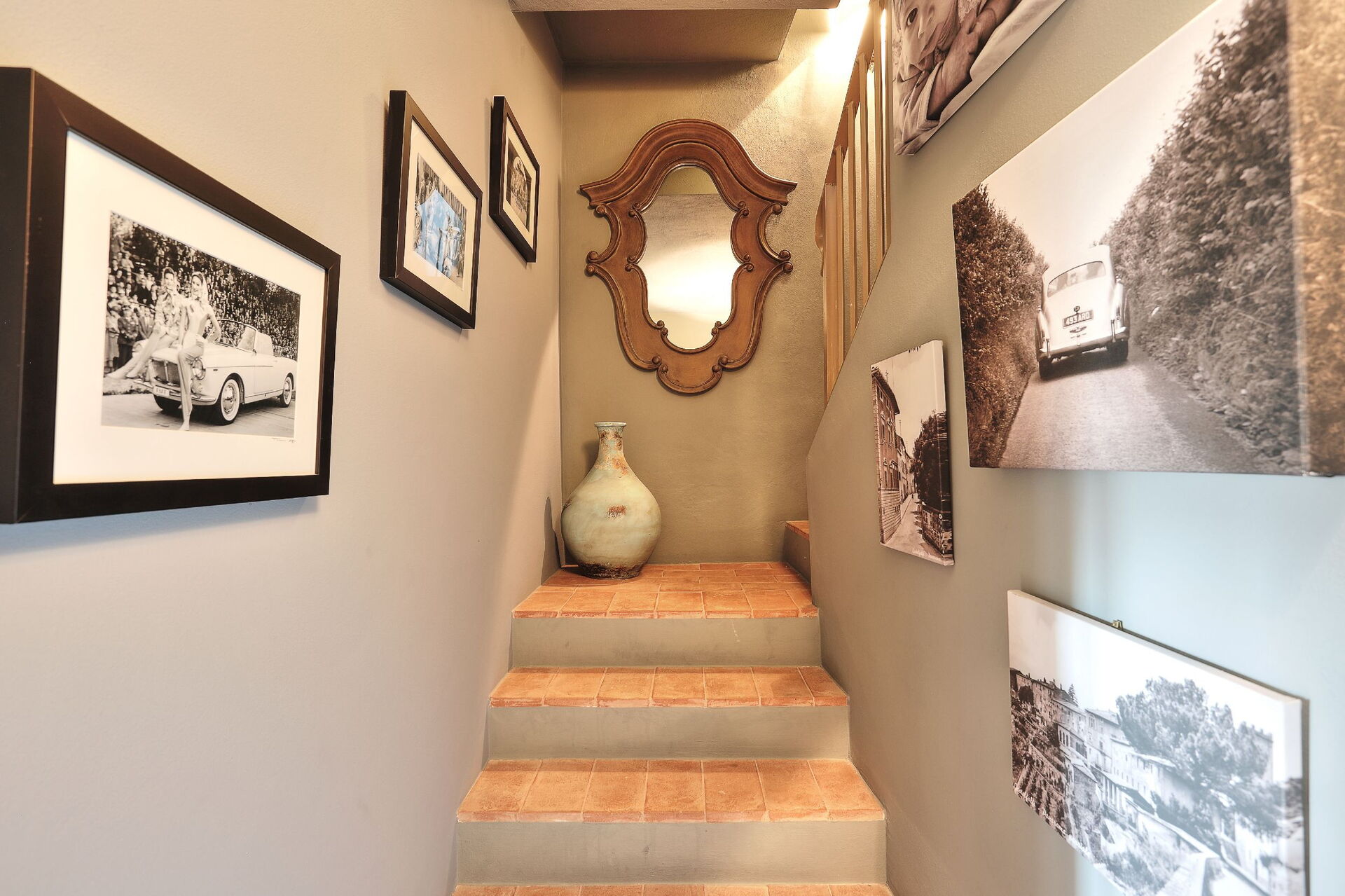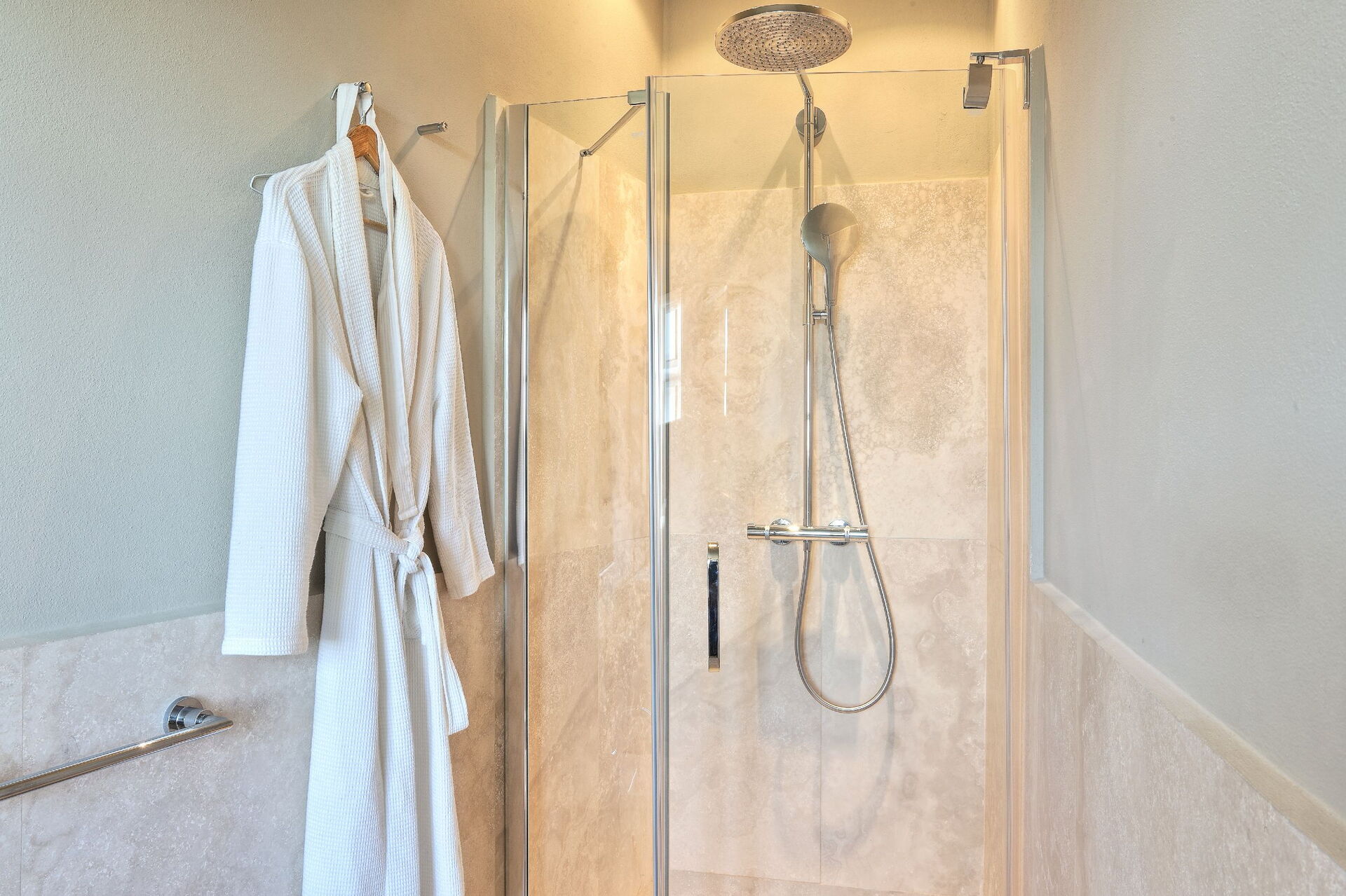 Zweite Etage: Wohnzimmer, Essbereich, Küche (Kochfeld, Kühlschrank, Backofen, Geschirrspüler), Bad mit Dusche, überdachte Loggia (Sessel und Tisch) mit Panoramablick auf die Hügel, Schwimmbad und Golfplatz.