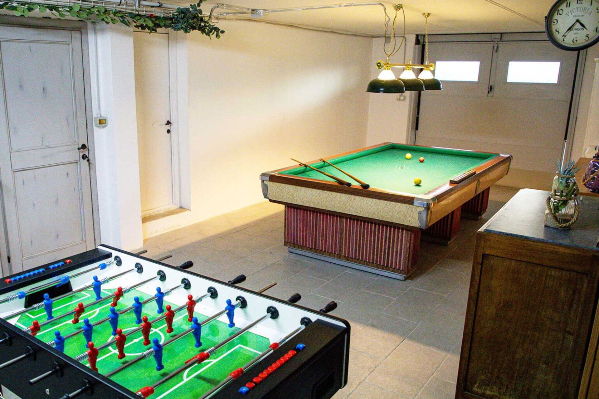 Untergeschoss (vom Wohnbereich über eine interne Treppe erreichbar): Raum mit Billard, Tischfußball, Sofa, kleiner Bibliothek und Brettspielen; Waschküche mit Waschmaschine, Trockner, Wäscheständer und Bügeleisen.
