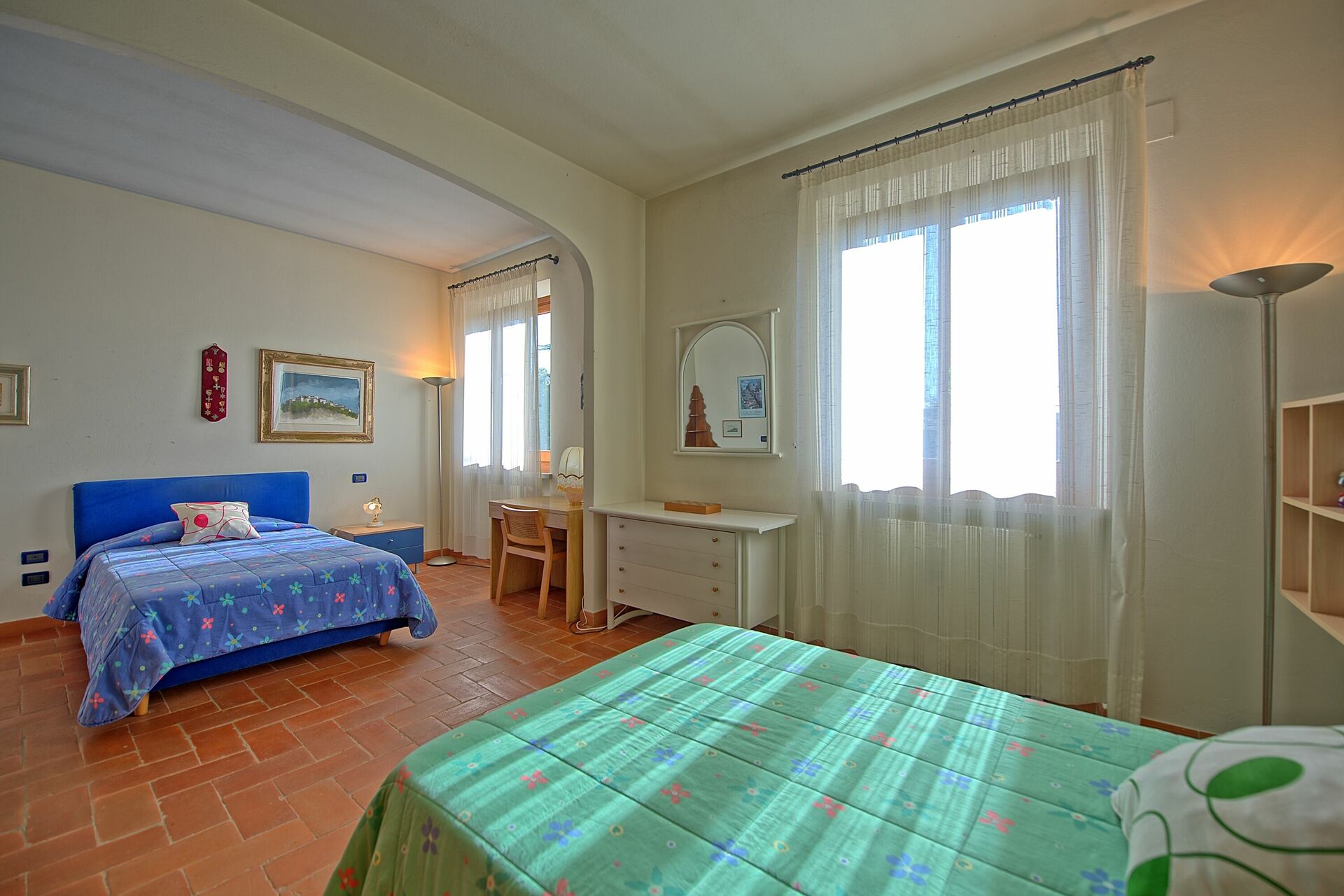 Erster Stock (zugänglich vom zweiten Wohnzimmer): Schlafzimmer mit Doppelbett (Klimaanlage), Schlafzimmer mit 2 französischen Einzelbetten (Klimaanlage), Badezimmer mit Dusche und Badewanne, Zugang zur großen Terrasse.