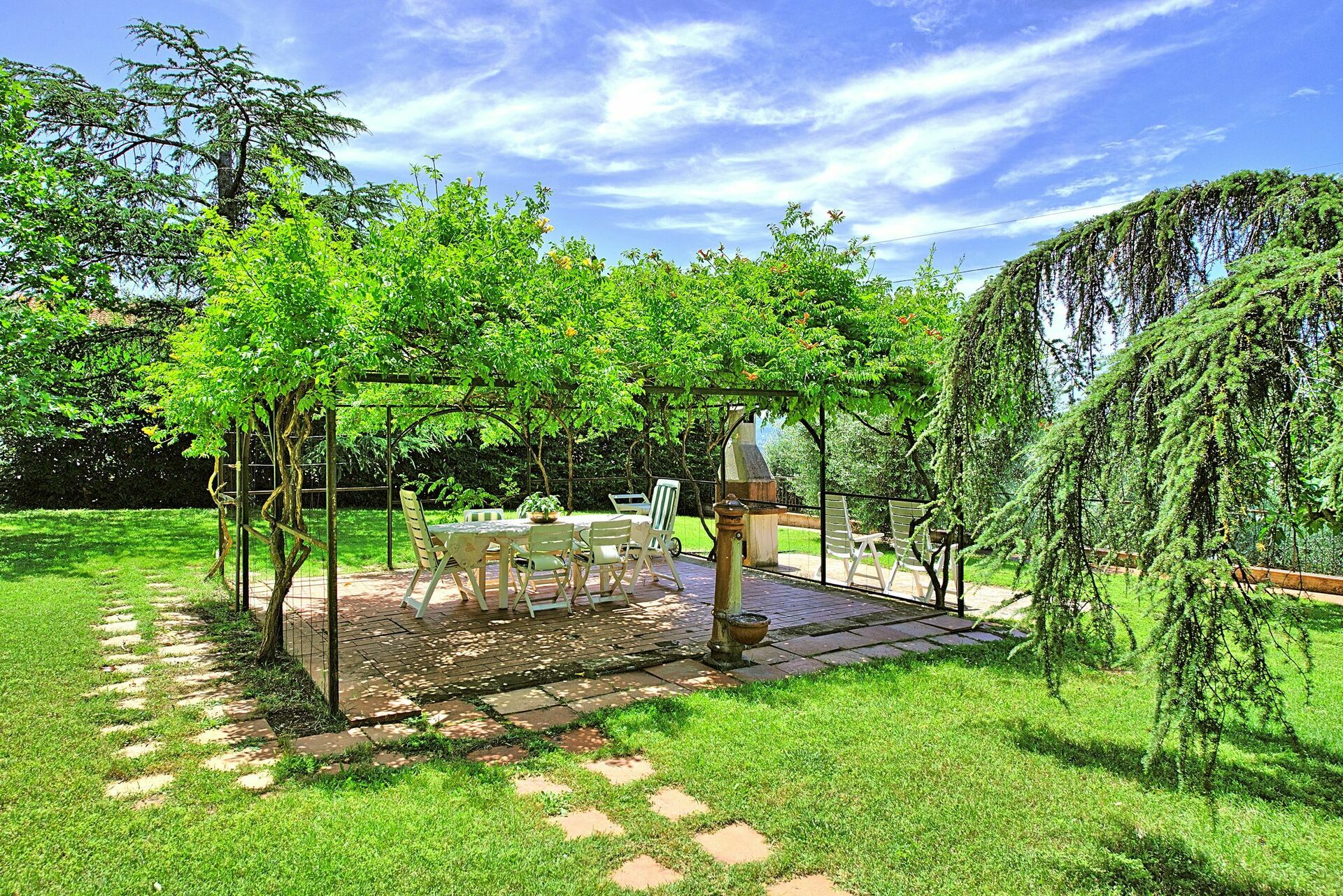 - Garten mit Pavillon ausgestattet mit Tisch, Stühlen und eingebautem Grill