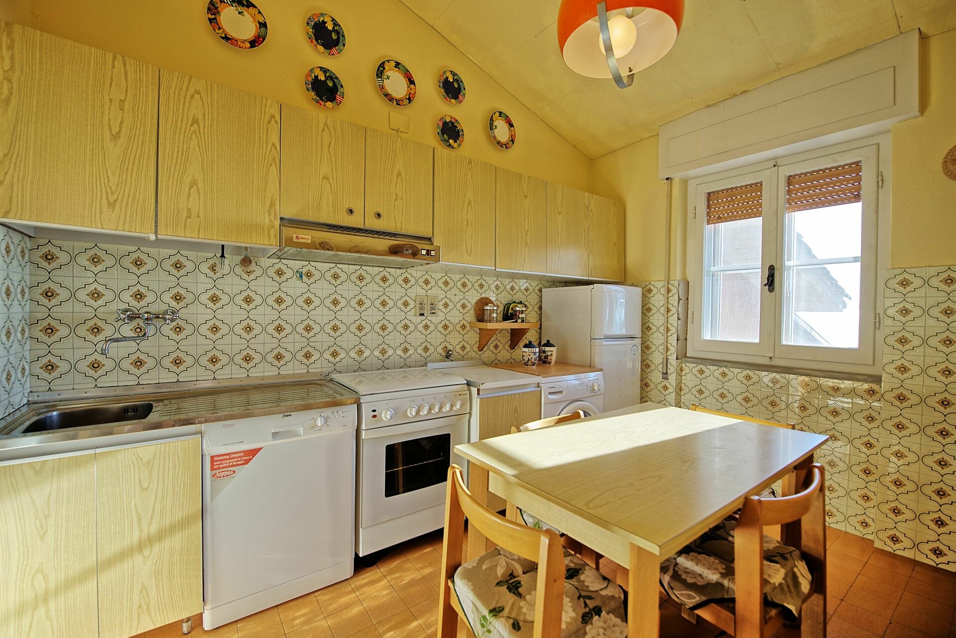 Erdgeschoss:Eingang zum hellen Wohnzimmer mit Essbereich und mit Zugang zur ausgestatteten Panorama-Terrasse, Küche (Backofen, Gefrierschrank, Spülmaschine, Waschmaschine), Doppelzimmer mit Ehebett, kleines Zweibettzimmer, Bad mit kleiner Badewanne.