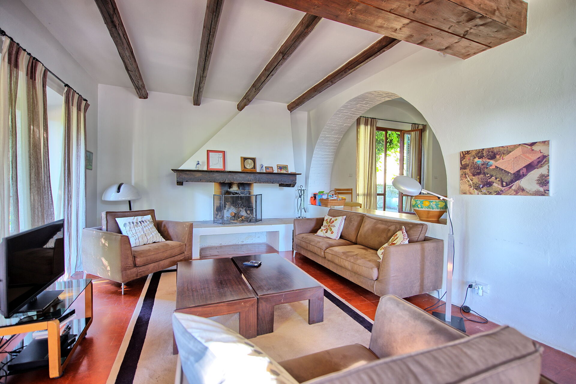 2 Stufen tiefer:Grosses Wohnzimmer mit funktionierendem Kamin, eingerichtet mit Sesseln und Sofas, Satelliten-TV LCD. Gegenüber befindet sich ein Schreibtisch mit Computer und Drucker der den Gästen zur Verfügung steht. Das Wohnzimmer hat grosse Fenstertüren die auf die Terrasse mit Tischen und Stühlen führen um draussen essen zu können.