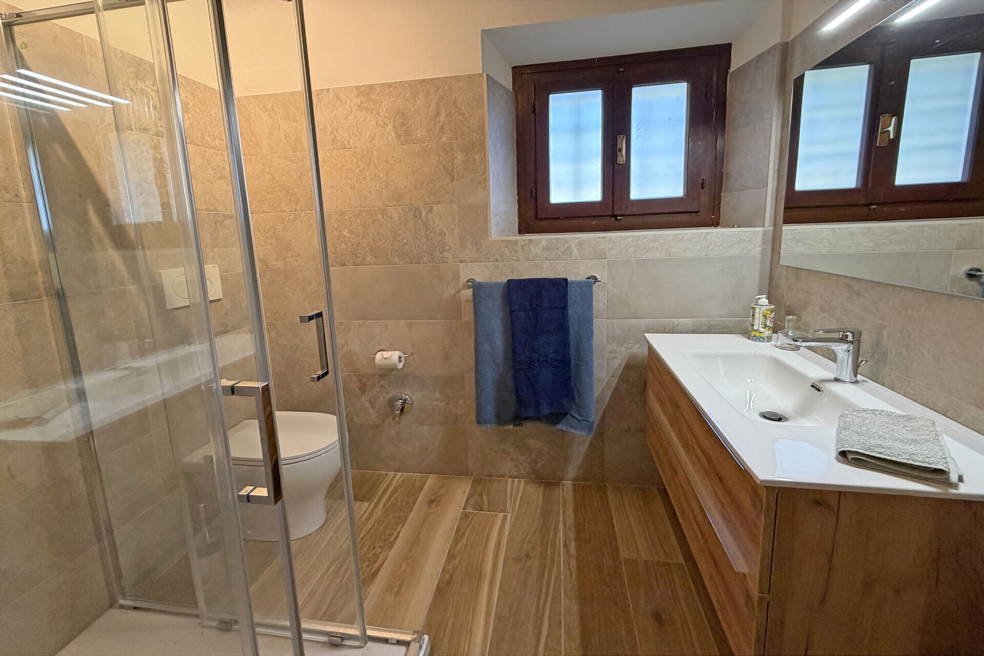 1. Stock: 12 Stufen führen zu einem Vorraum von dem rechts ein Doppelzimmer mit Ehebett und ein Zimjmer mit französischem Ehebett abgeht. Angrenzend an diese Zimmer befindet sich ein Bad mit Dusche. Auf der gegenüberliegenden Seite befindet sich ein Doppelzimmer mit Ehebett mit direktem Zugang zum Garten (über eine Treppe zu erreichen); Zweibettzimmer, Einzelzimmer; den 3 Zimmern steht ein angrenzendes Bad mit Dusche zur Verfügung.