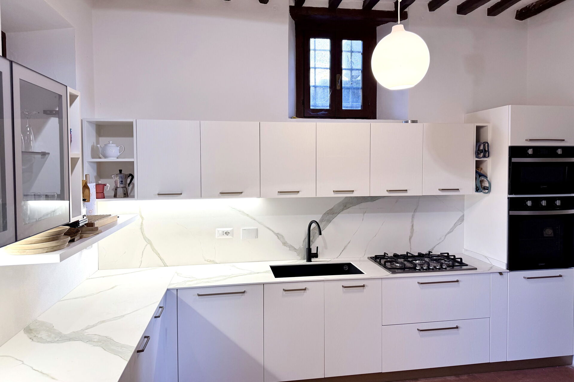 Erdgeschoss:Eingang zum Esszimmer mit offener Küche und Esstisch für 10 Personen, sehr gut ausgestattete Küche mit 4 Gasflammen, Toaster, Spülmaschine, amerikanischer Kaffemaschine, Moka, Kühlschrank mit Gefrierfach.
