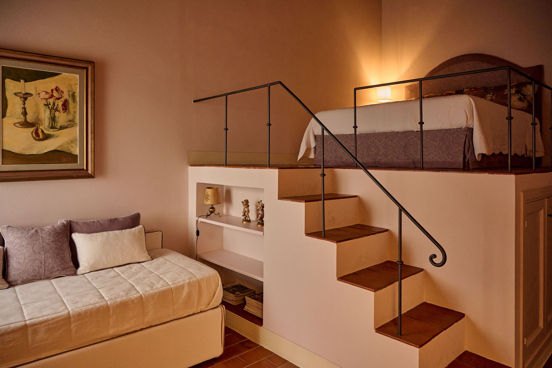Erster Stock: Doppelzimmer mit privatem Bad mit Dusche und großem begehbarem Kleiderschrank, Suite mit Sitzecke und Bad mit Dusche mit Zugang zum Doppelzimmer (4 Stufen tiefer), Doppelzimmer mit privatem Bad mit Dusche , Zweibettzimmer, Badezimmer mit Dusche, Doppelzimmer mit privatem Bad mit Dusche, Schlafzimmer mit privatem Bad mit Dusche und Zugang zum Zwischengeschoss mit Doppelbett.