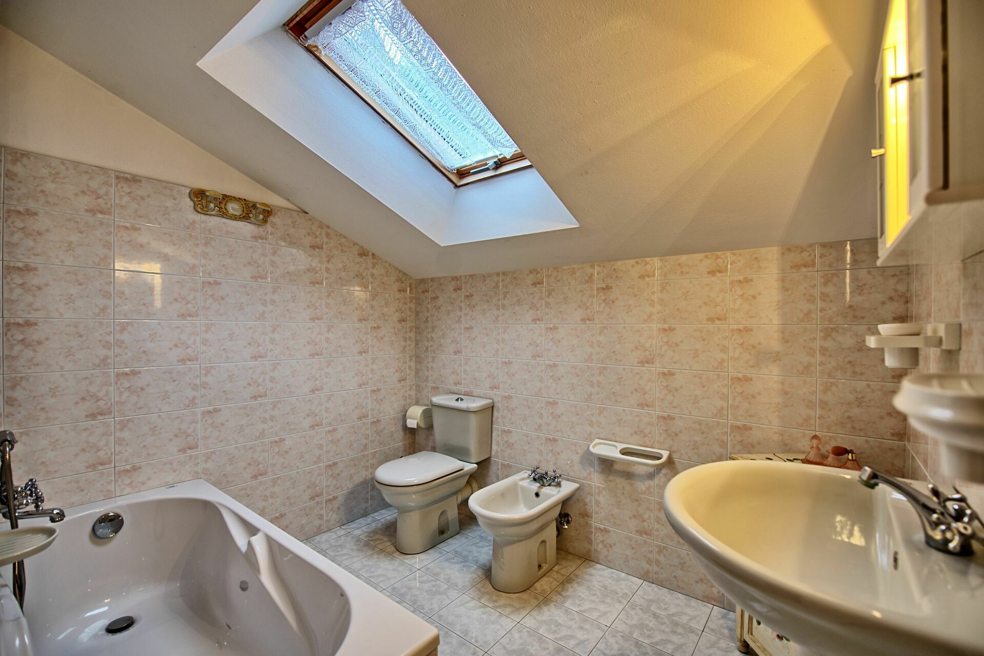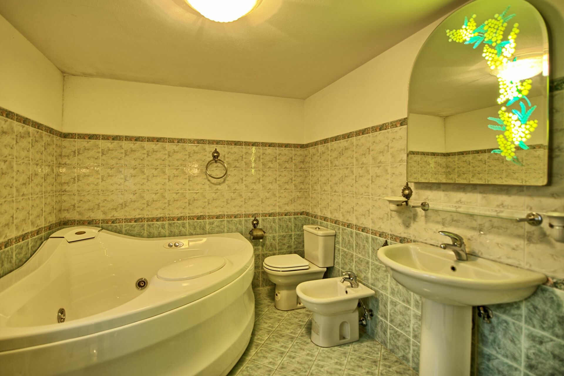 3 Stufen höhervom Wohnzimmer aus: Bad mit Whirlpoolbadewanne.