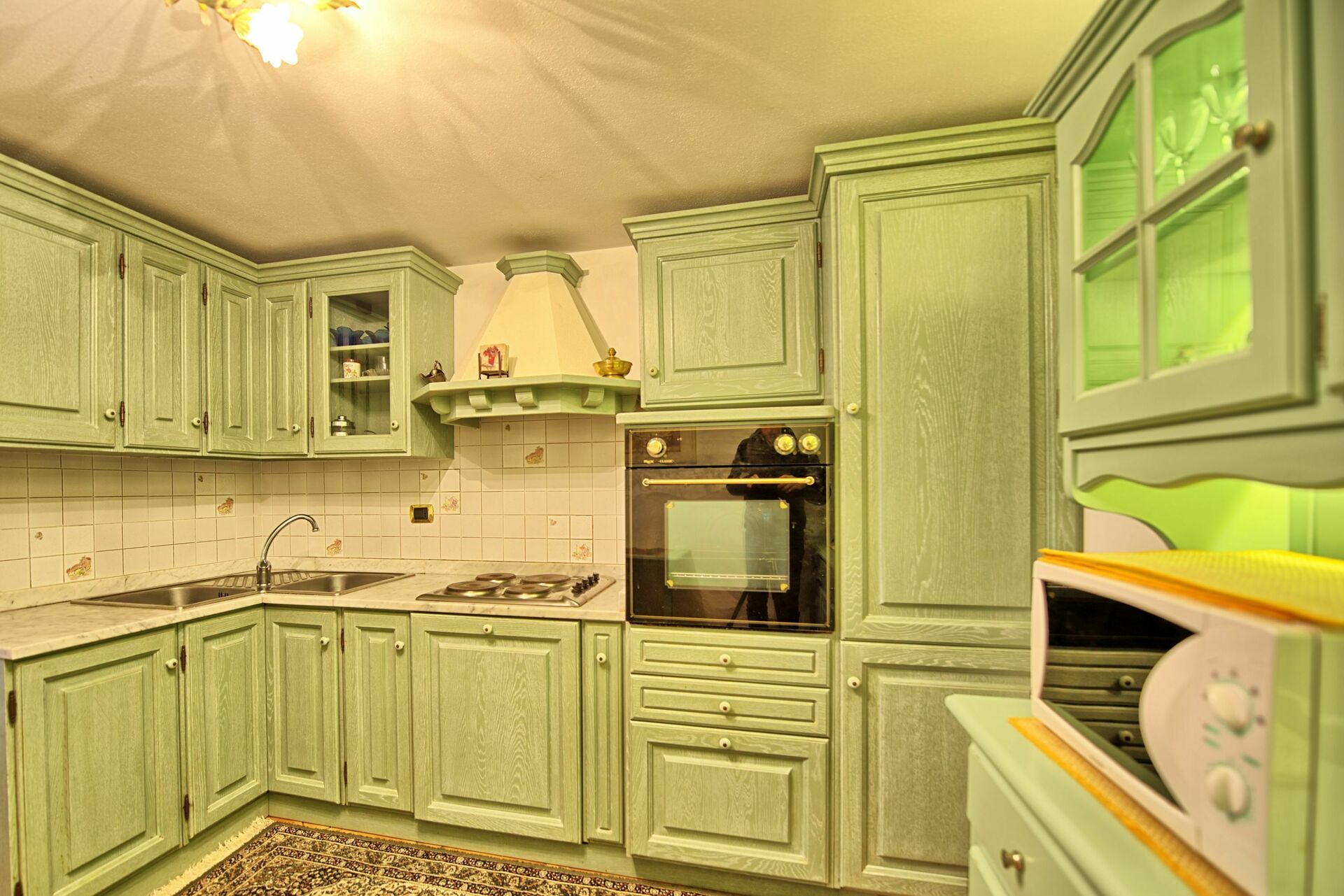 3 Stufen höher: Küche (Backofen, Gefrierschrank, Spülmaschine, Mikrowelle, 4 elektrische Herdplatten).