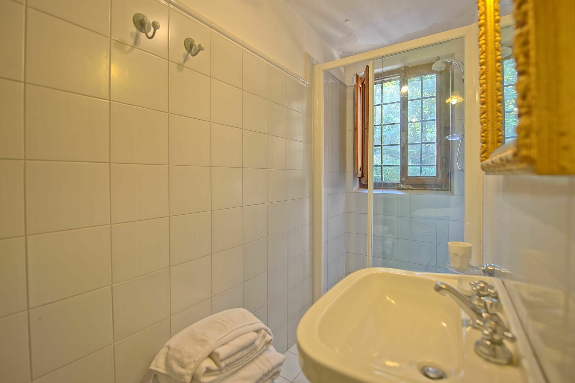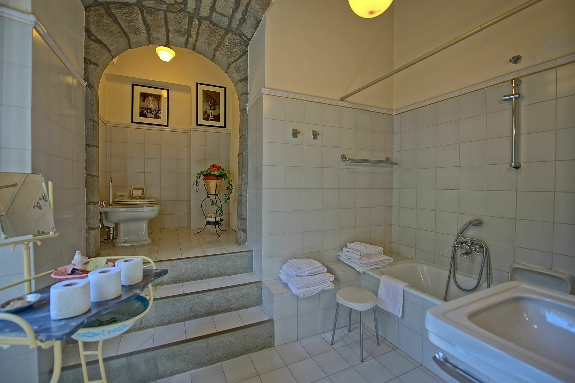 Erster Stock: großes Wohnzimmer mit Steinkamin und vier Doppelzimmer (zwei mit privatem Bad mit Dusche und zwei mit Gemeinschaftsbad mit Dusche und Badewanne).