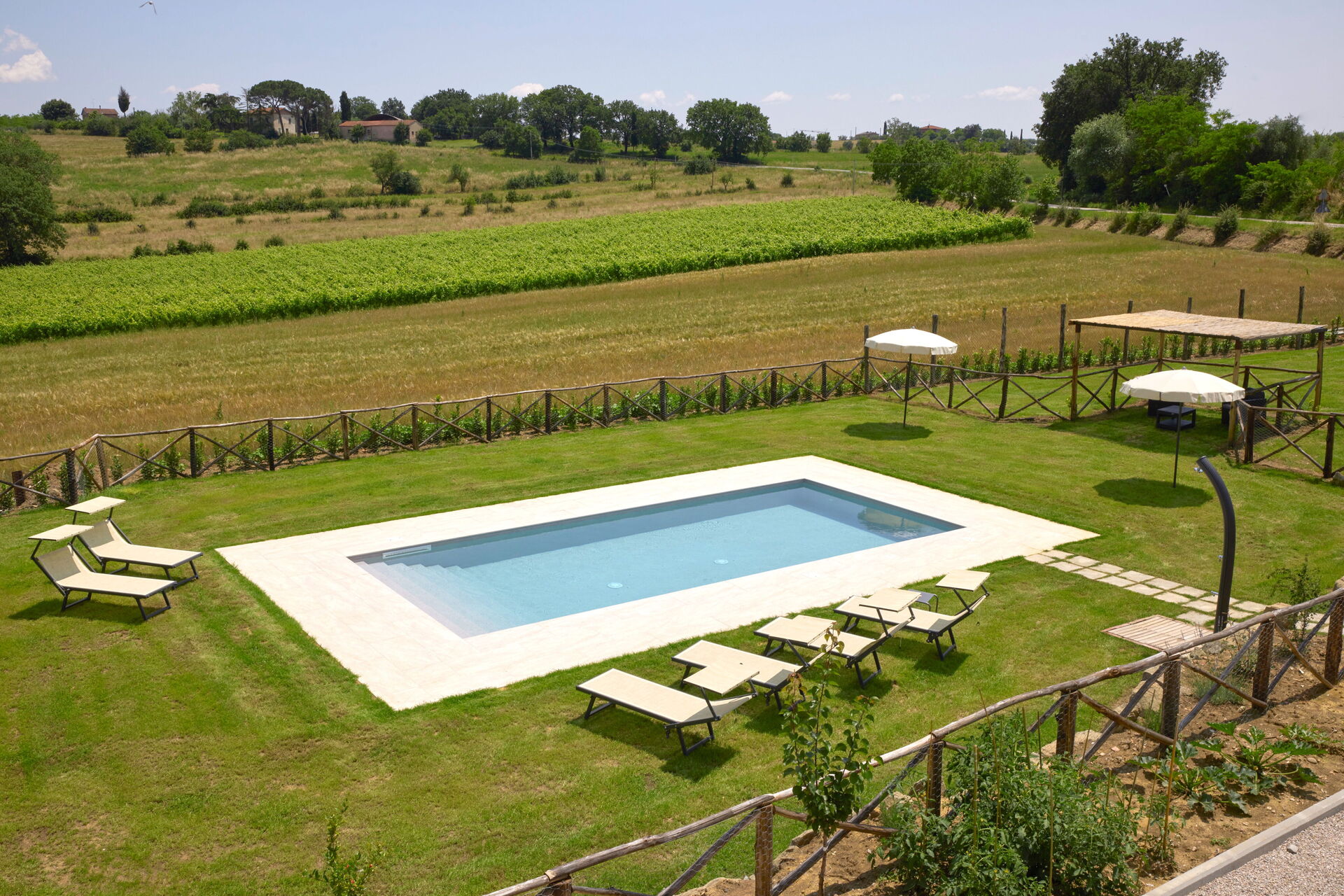 Die Außenbereiche sind sicherlich die Stärke des Hauses: Ein gepflegter Garten bietet endlose Entspannung, auch dank seiner Terrassen und eines Schwimmbades, das den Gästen exklusiv vorbehalten ist; Die Villa Vigneto ist der ideale Ort zum Entspannen und Erfrischen an sonnigen Sommertagen in der Toskana.