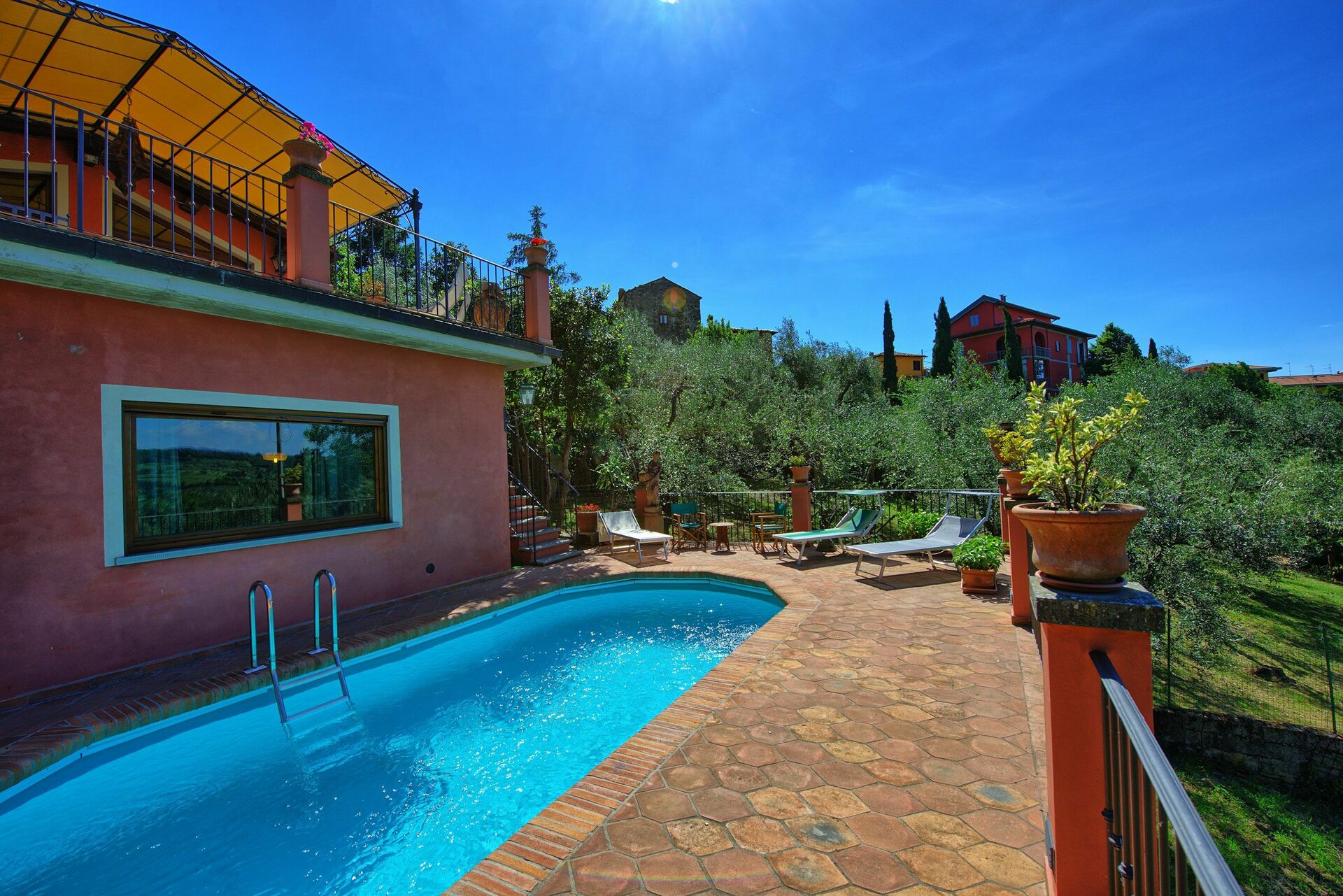 Im Aussenbereich steht ein Grillplatz, eine Terrasse mit Pavillon, Tische und Stühle um draussen essen zu können und um Grillabende organisieren zu können zur Verfügung, sowie auch ein schönes Schwimmbad in Panoramalage exklusiv für die Gäste mit Sonnenterrasse, Sonnenliegen und Sofas zum ausruhen. Trotz der Lage im Zentrum des Ortes garantiert das Haus seinen Gästen Privatsphäre.