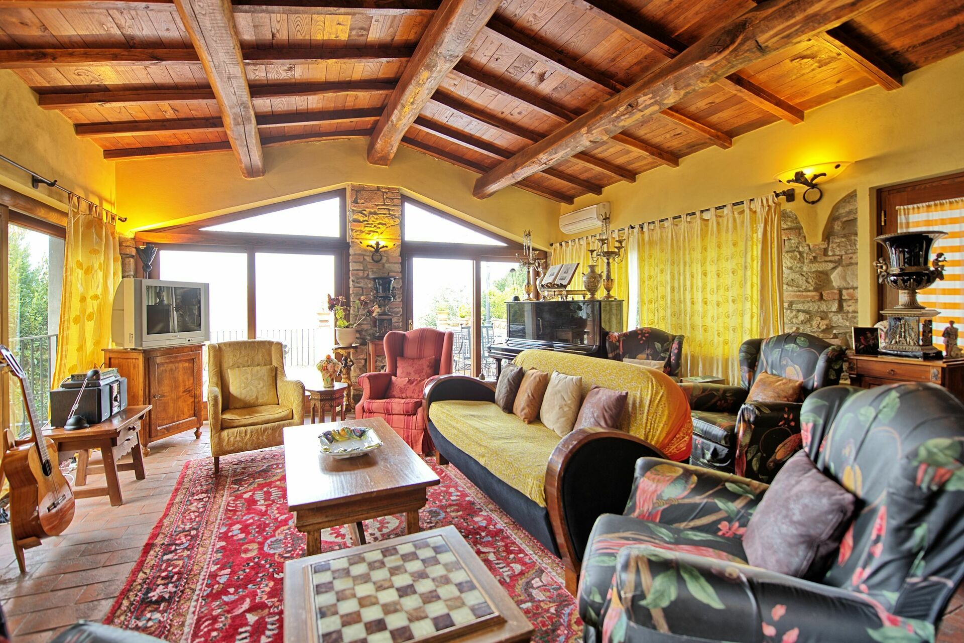 Erdgeschoss: helles Wohnzimmer mit Klavier, Satellitenfernsehen und Zugang zur Panoramaterasse mit Laube, Tischen und Stühlen.