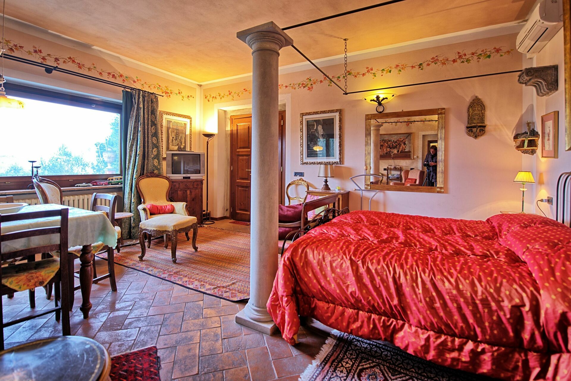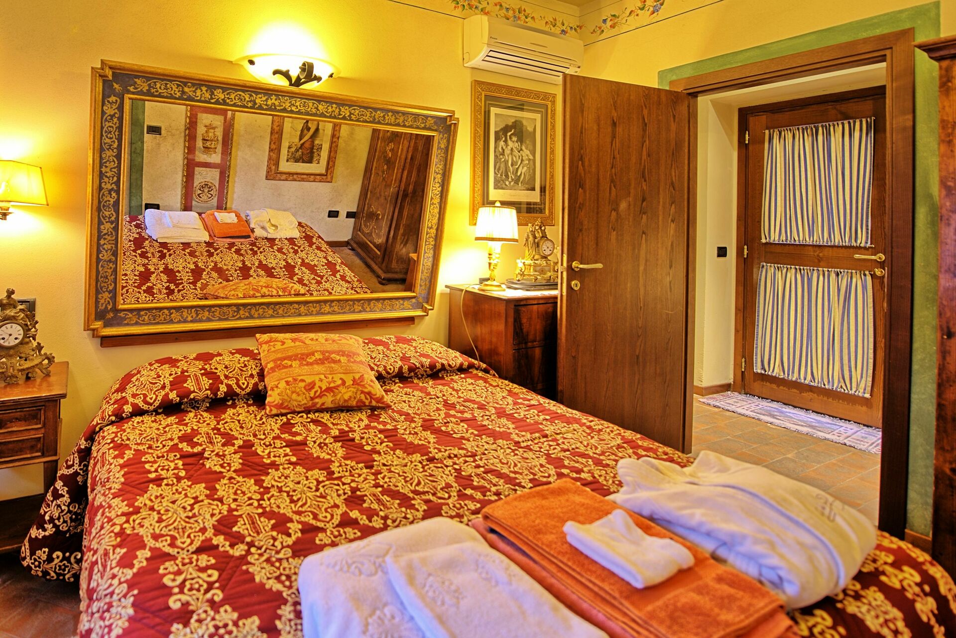 Die Villa ist sehr sorgfältig und mit viel Geschmack eingerichtet, mit wertvollen Verzierungen und Afresken an den Wänden. Die geräumigen und komfortablen Innenräume sind ideal für eine Familie oder eine Gruppe von Freunden, die einen Aufenthalt in absoluter Ruhe mit Privatsphäre verbringen möchten und gleichzeitig in der Stadt wohnen möchten. Das Ferienhaus ist in zwei Einheitenunterteilt: Die Hauptwohnung verfügt über die wichtigsten Gemeinschaftsräume, eine große, ausgestattete Küche und zwei Doppelzimmer, beide mit eigenem Bad. Das separate Studio verfügt über ein Schlafzimmer, ein Badezimmer und eine Küchenzeile mit Essbereich. Alle Zimmer sind mit Klimaanlage ausgestattet.