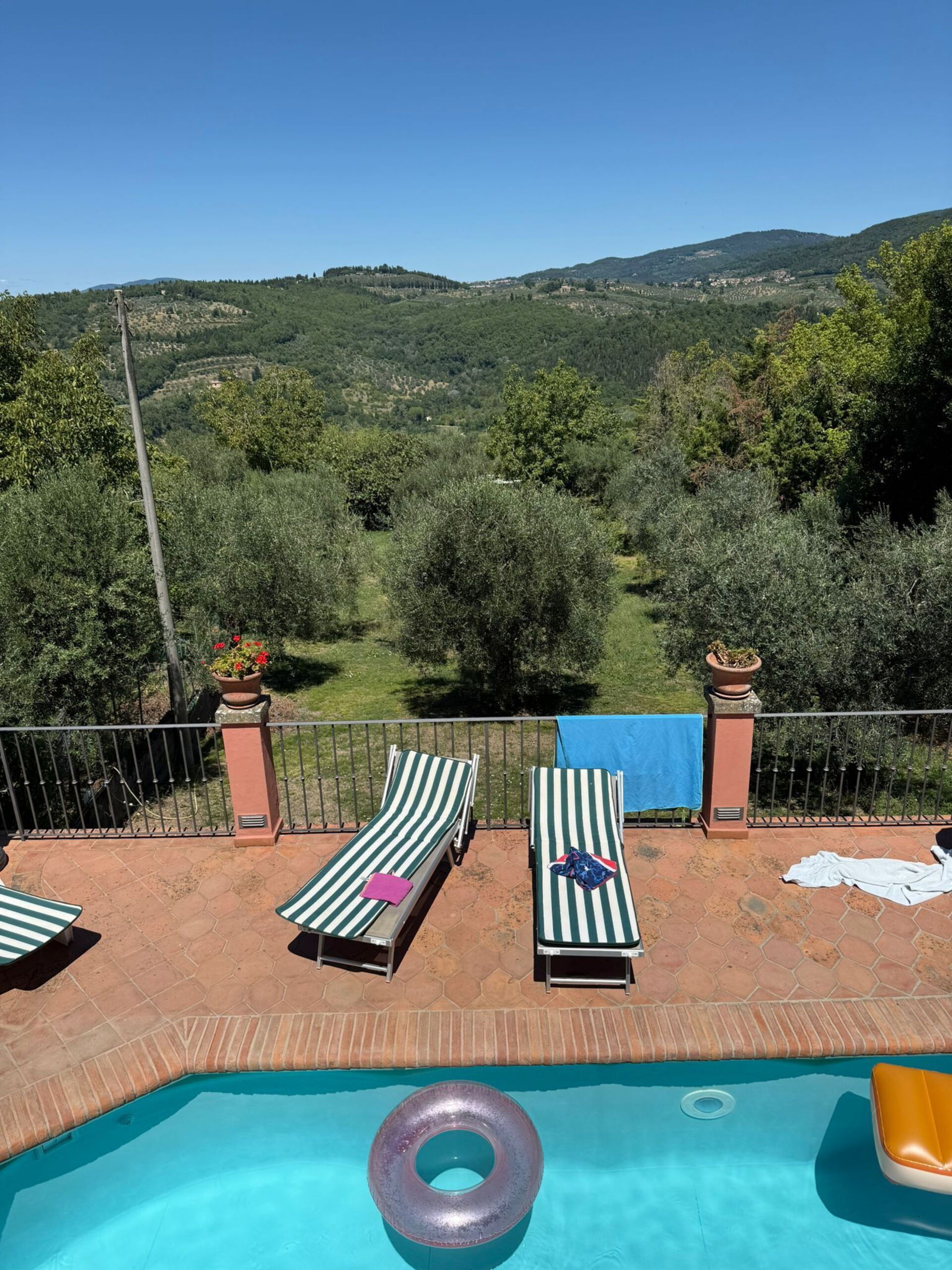 The house was AMAZING! The view off the terrace was breathtaking, even when it rained. We spent most of the time on the patio taking in the views but also explored the town, which was peaceful and charming. There’s a market, bar, and cafe within 100 steps of the house, very convenient. You need a car if you want to leave the town much, but the drive to Florence was less than an hour and so was the drive to wineries in Chianti. My husband and I stayed with my 8-month old baby and the host had a baby crib and high chair ready for us, which was wonderful! The mother in law suite was great too, but it was not connected to the house so my mom had to walk outside to get to the main house, but it was nice weather so not too inconvenient. They also checked us in around midnight when we were delayed at the airport and had a bottle of wine waiting after a long journey. Would stay again in a heartbeat. We didn’t want to leave!