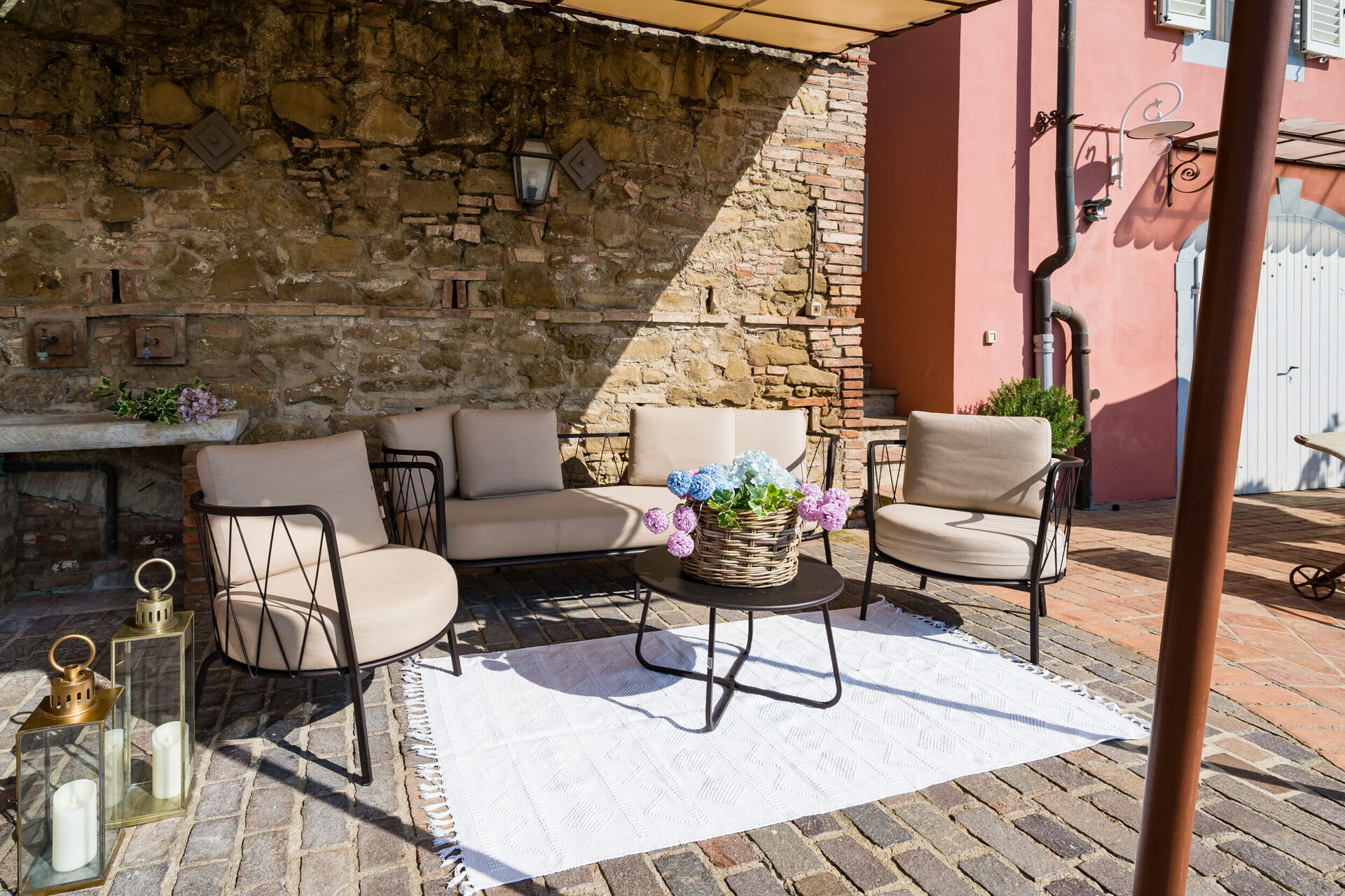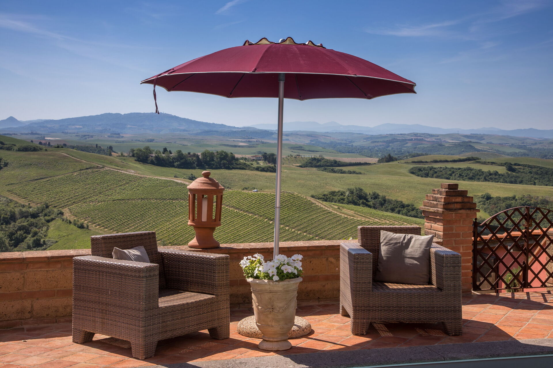 Die Ferienvilla verfügt über einen Außenbereich, der zum Essen eingerichtet ist und einen Panoramablick über die typisch toskanische Landschaft bietet.