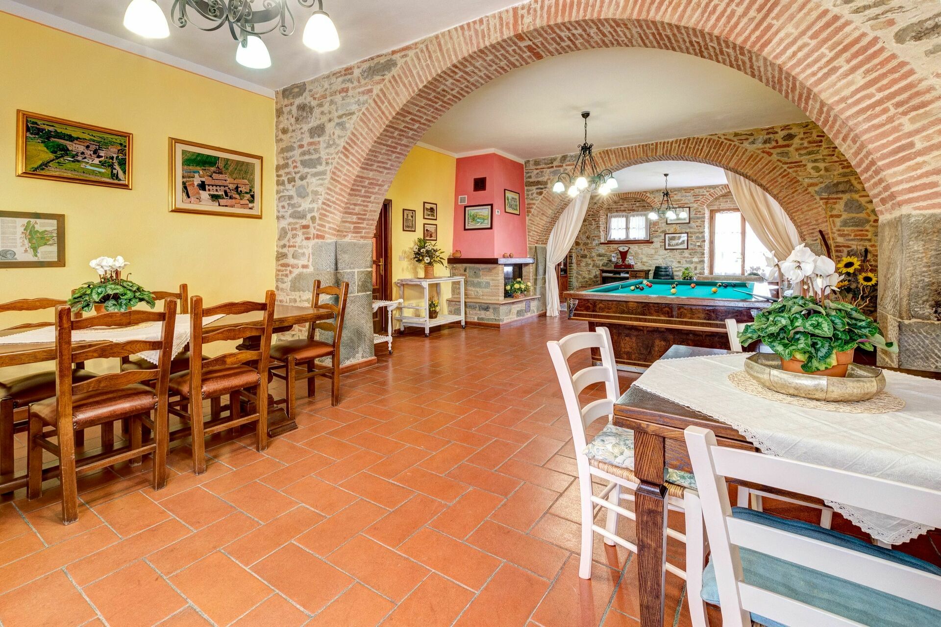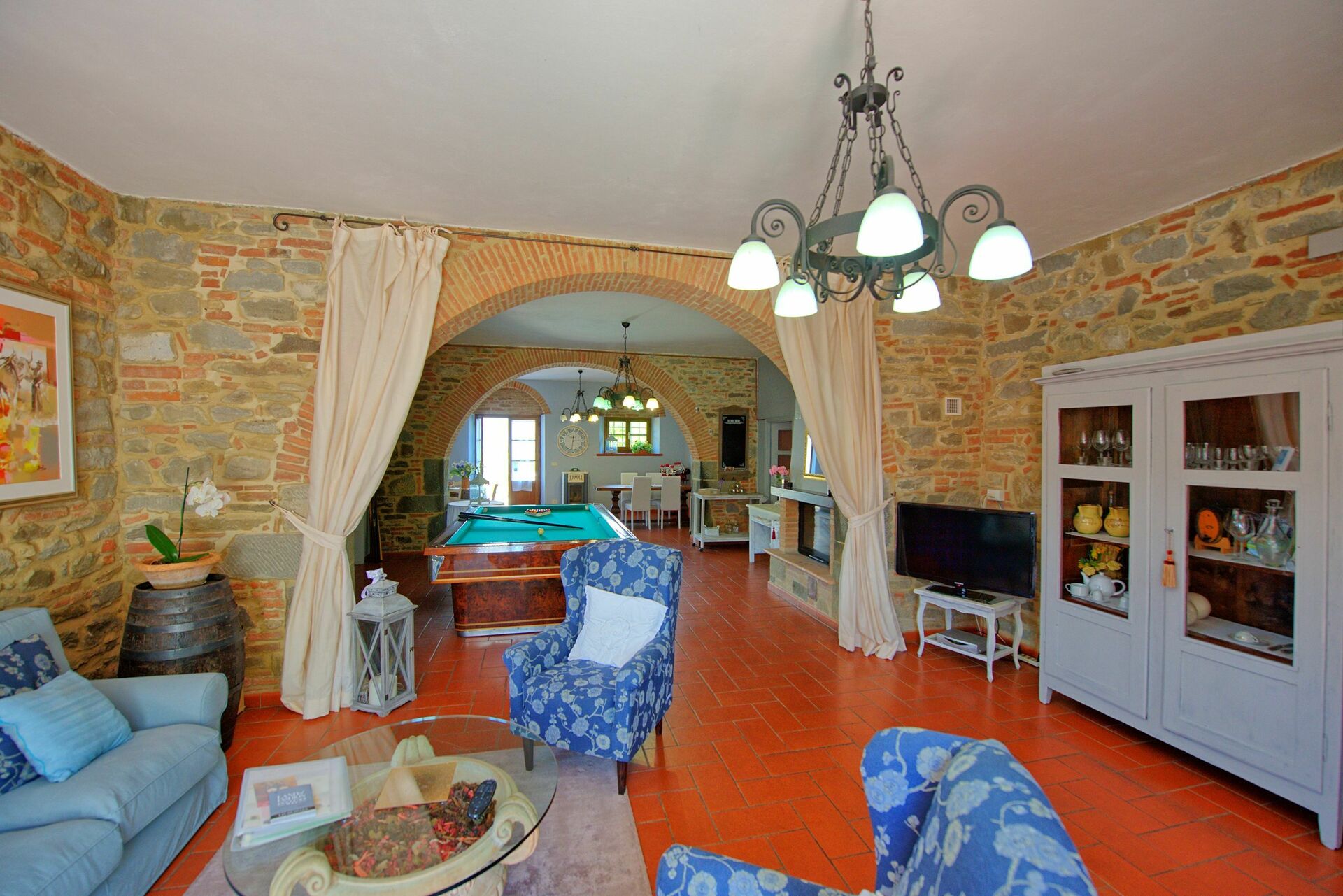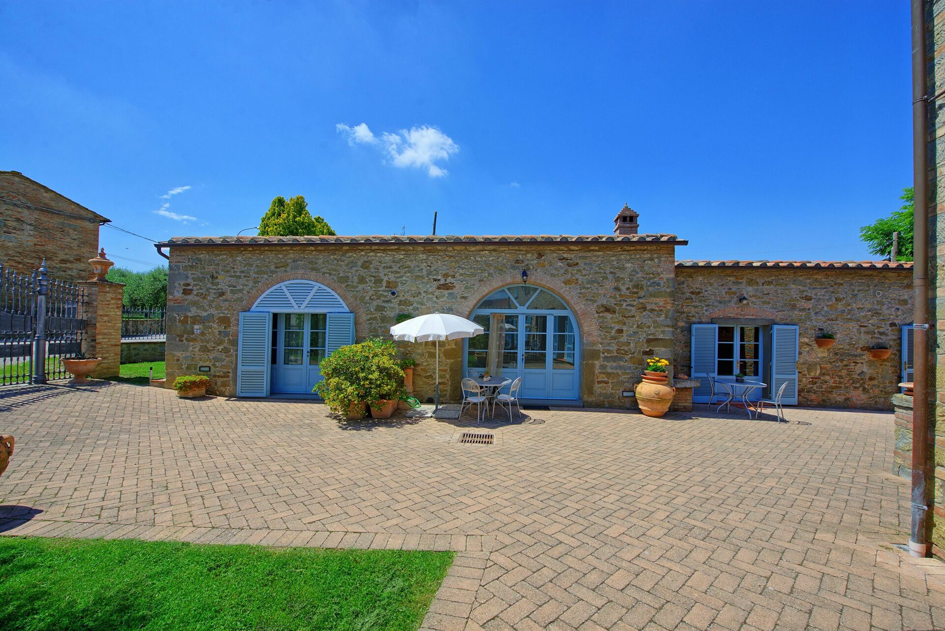 Die Panorama-Lage über der typischen toskanischen Landschaft, umgeben von goldenen Feldern, sowie der hohe Komfort und die ansprechende Innenausstattung machen diese Villa zu einem einzigartigen Rückzugsort, an dem moderne Architektur und traditionelle Bauweise harmonisch verschmelzen. Das Landhaus wurde nach originalen Vorgaben renoviert, um den historischen Charme zu bewahren, und ist in acht geschmackvolle Apartments unterteilt, die jeweils über eine Küchenecke verfügen. Ein großer Wohnsaal mit Kamin und eine voll ausgestattete Küche stehen den Gästen ebenfalls zur Verfügung.