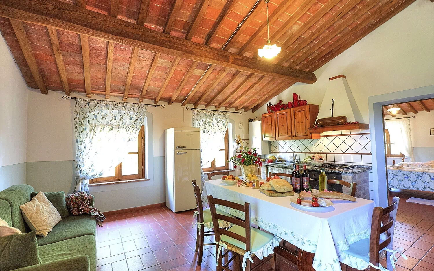 1. Stock: Wohnzimmer mit Essbereich und Doppelschlafsofa, Kochecke (Backofen, Kühlschrank), Doppelzimmer, Doppelzimmer mit 2 Einzelbetten (die Betten können auf Wunsch zusammengestellt werden), Bad mit Dusche. keiner Balkon.