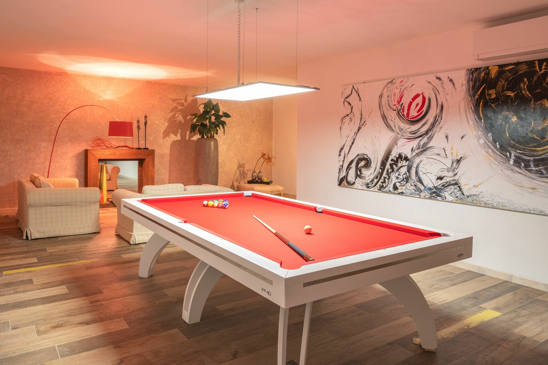 Die Eirichtung der Villa ist exklusiv, modern und raffiniert. Der Außenberiech verfügt über viel Platz für Spaß und Erholung wie den großen Pool mit Solarium, einen schönen Grillplatz und einem Holzofen, eine Feuerstelle und große Grünflächen.