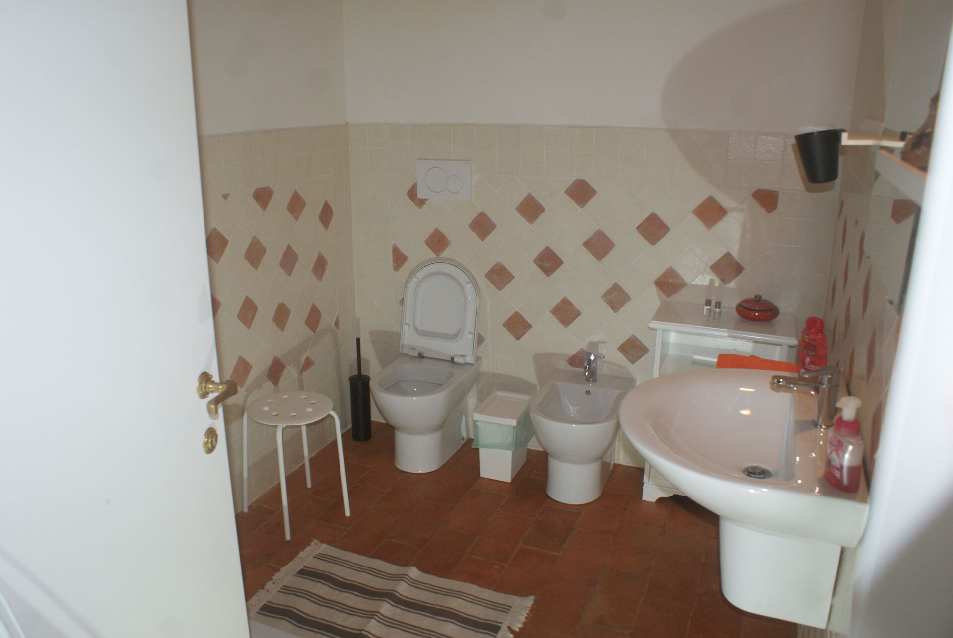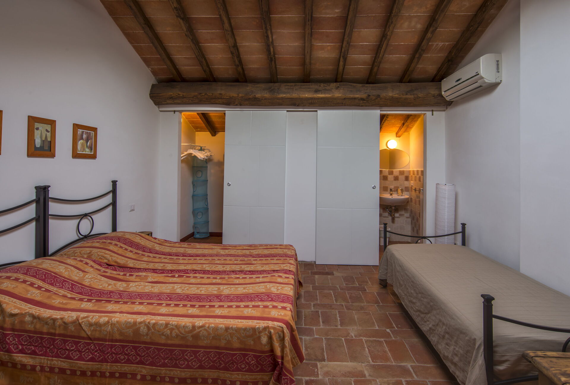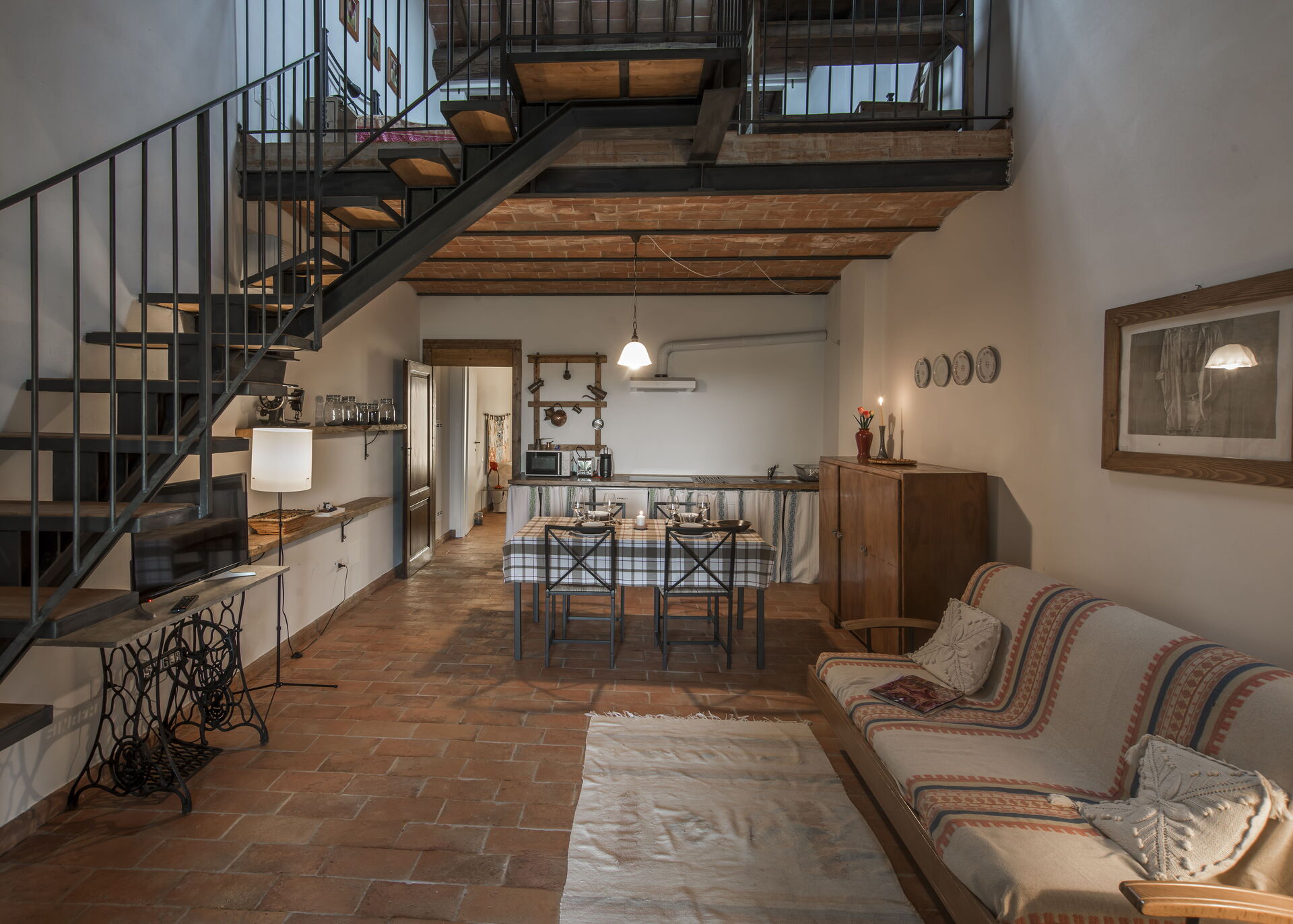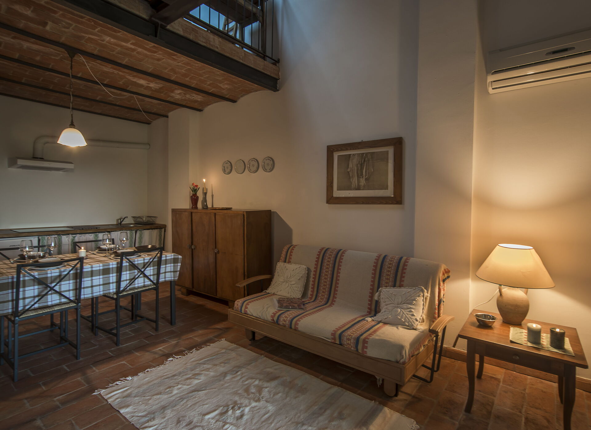 Erster Stock: großer Wohnbereich mit Wohnzimmer (mit zusätzlichem Doppelschlafsofa auf Anfrage) und Zugang zu einem Zwischengeschoss mit Doppelbett (auf Anfrage in 2 Einzelbetten umwandelbar) und einem Einzelbett und einem Badezimmer mit Dusche; Essbereich mit Küche (Geschirrspüler, Backofen, Kühlschrank, Induktionskochfeld, Mikrowelle, Kaffeemaschine, Ventilator), Schlafzimmer mit Doppelbett, Badezimmer mit Dusche.