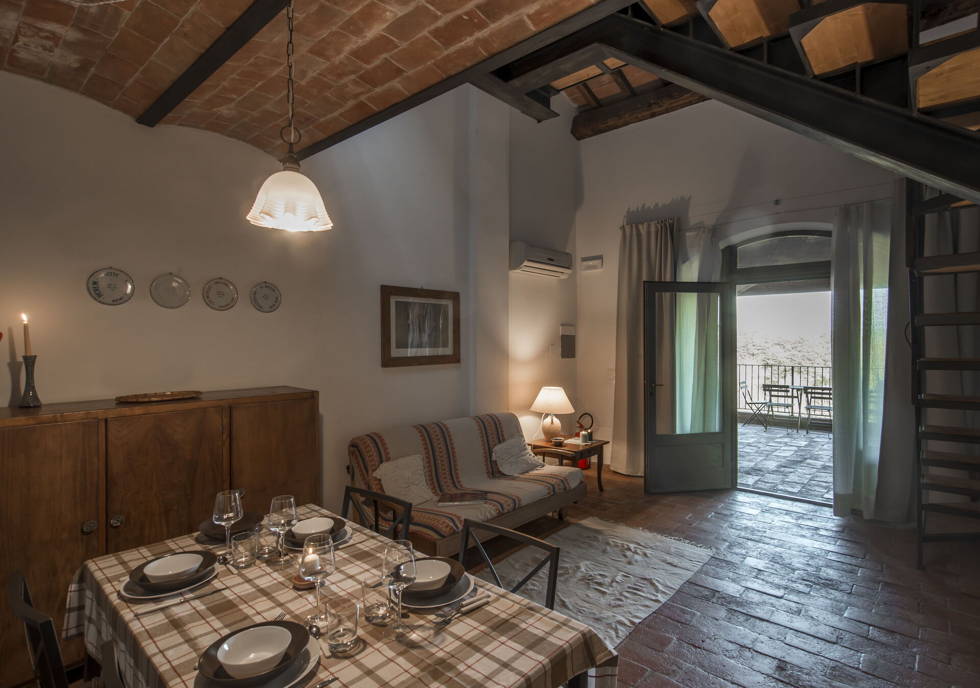 Privater Außenbereich unter einer Loggia, ausgestattet mit Tisch und Stühlen.