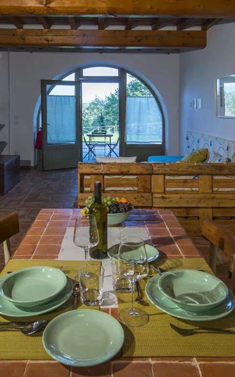 Erdgeschoss: Wohnbereich mit Wohnzimmer (mit 2 zusätzlichen Einzelschlafsofas auf Anfrage) und Essbereich mit Küche (Geschirrspüler, Backofen, Kühlschrank, Induktionskochfeld, Mikrowelle, Kaffeemaschine, Ventilator), Doppelzimmer, Badezimmer mit Dusche.