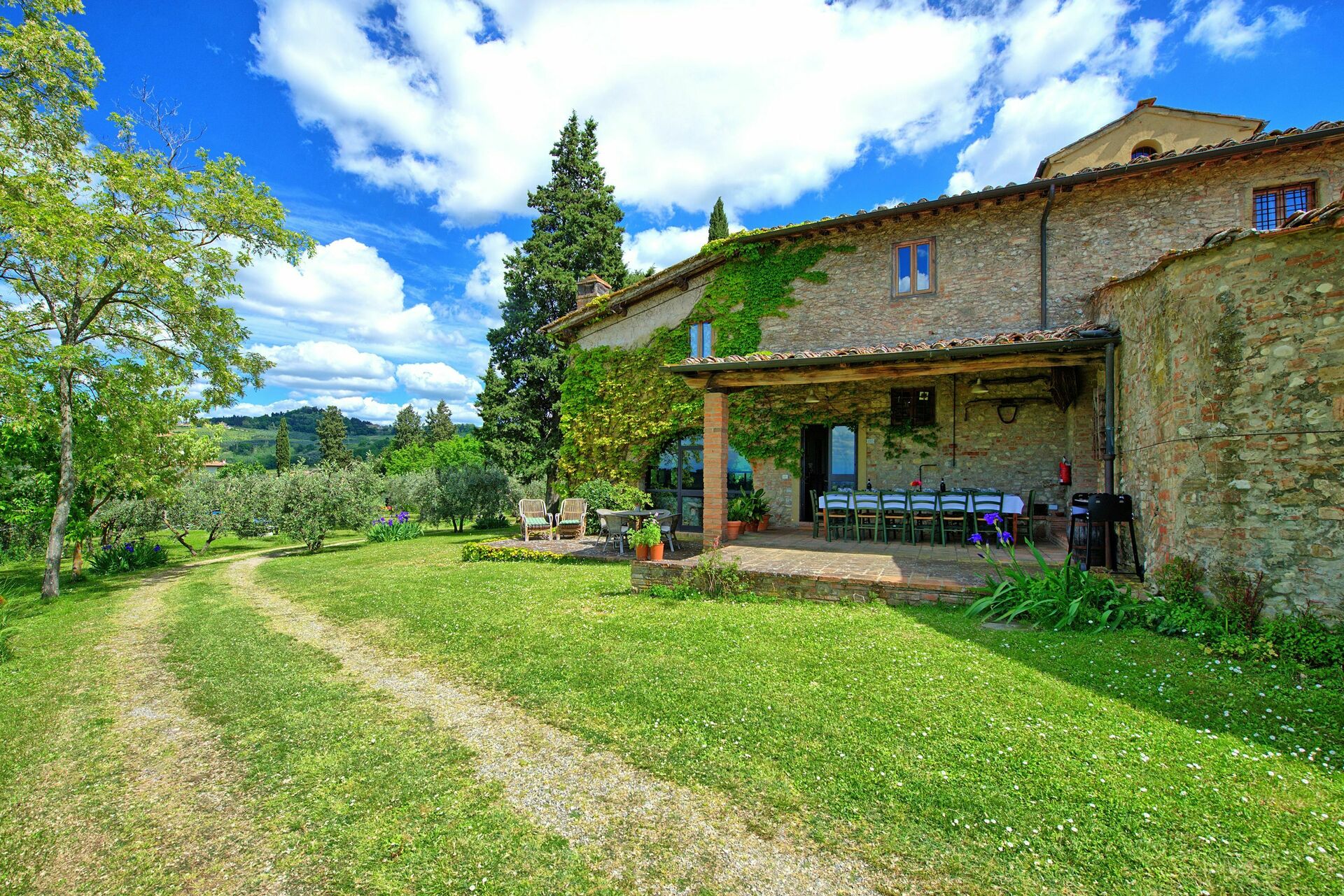 Wer seinen Urlaub hier verbringen möchte, wird von diesem Panoramahaus, umgeben von üppigem Grün auf den Hügeln des Florentiner Chianti, nicht enttäuscht sein. Eine einladende Veranda mit Tisch und Stühlen ermöglicht es den Gästen, die Mahlzeiten mit einem fantastischen Blick auf die Landschaft zu genießen.