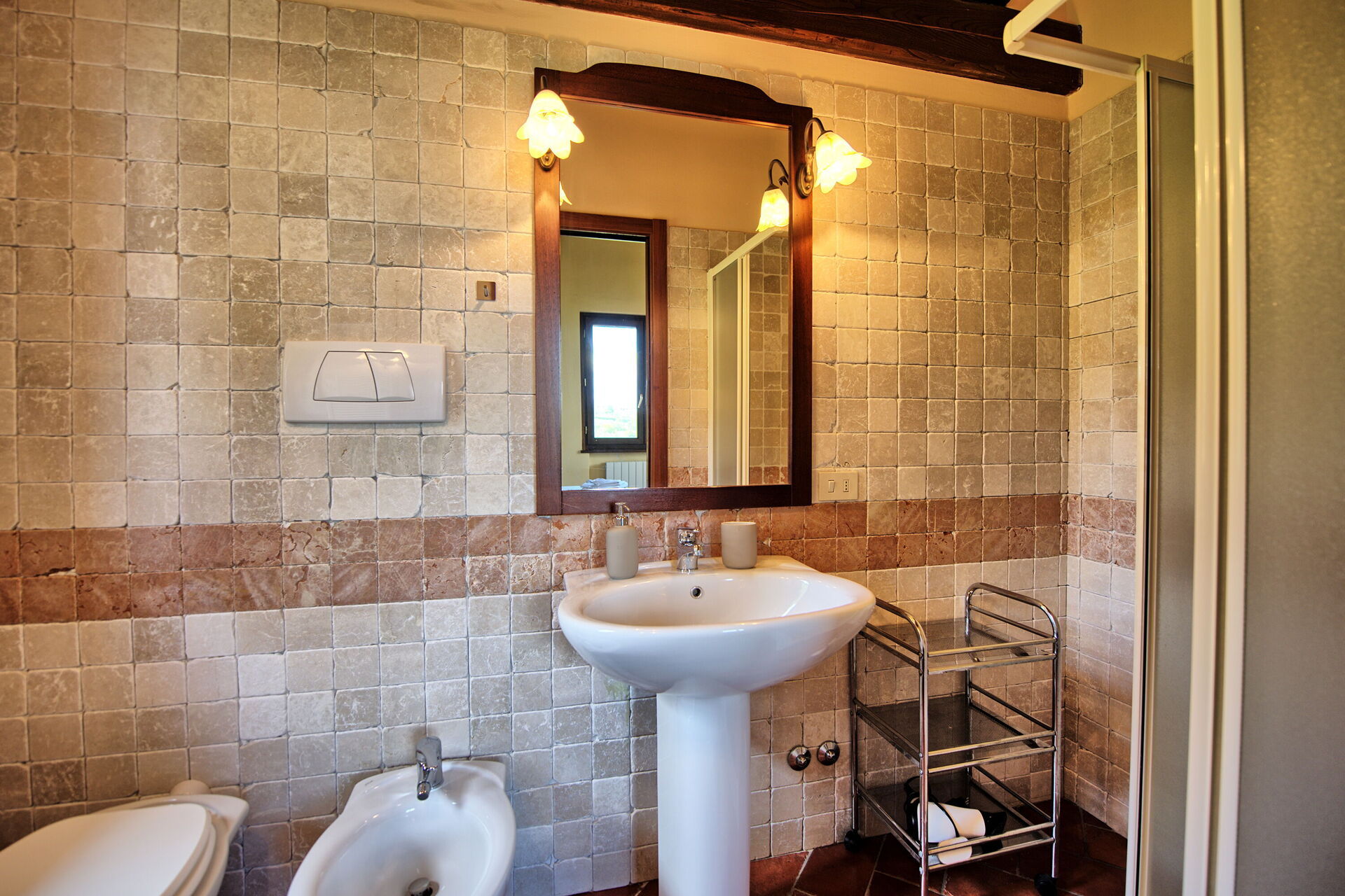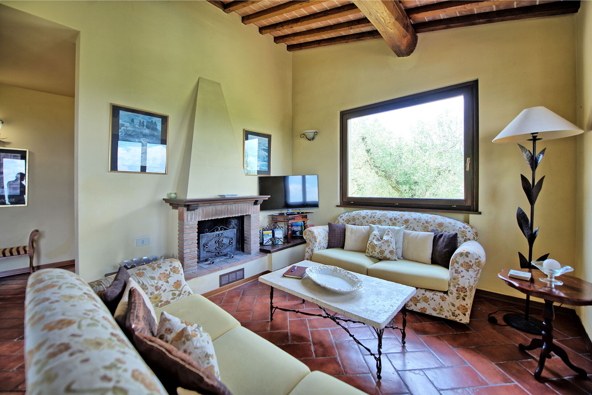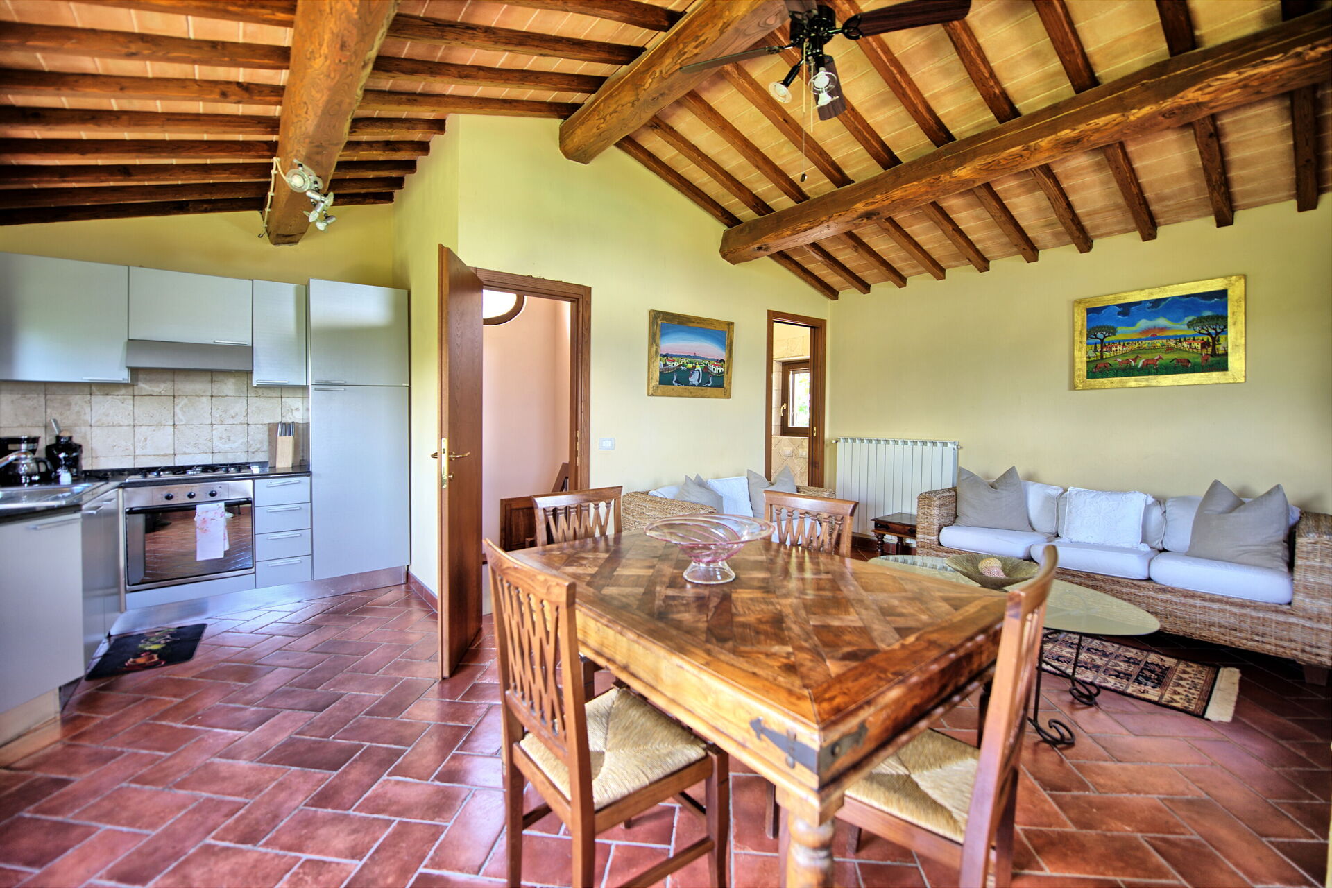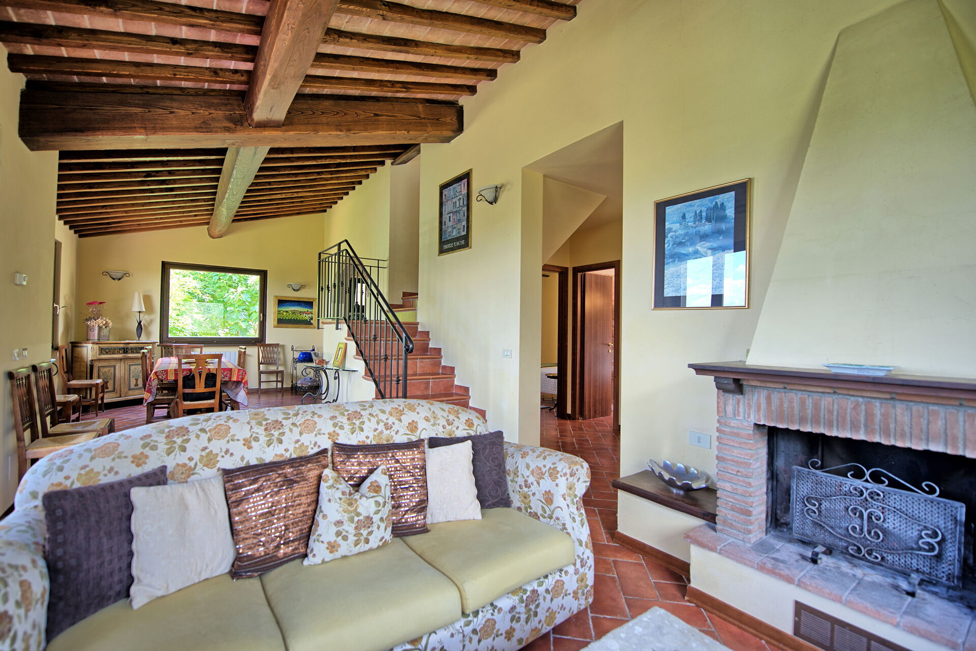 über typische Elemente der rustikalen toskanischen Landhäuser, wie Holzbalkendecken, Marmor, Terrakottaböden und Steinwände.