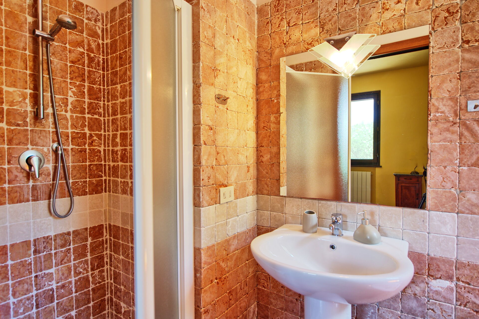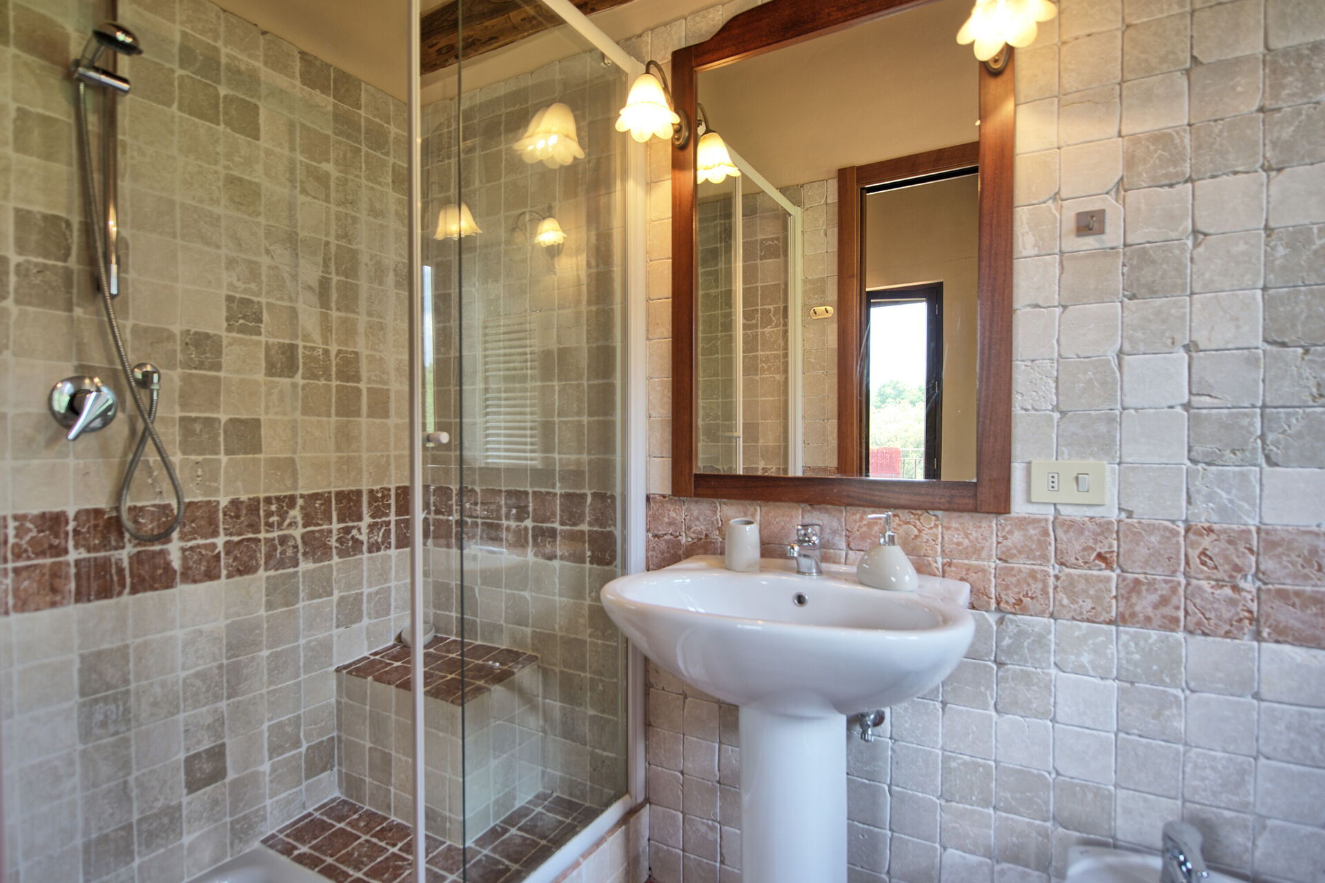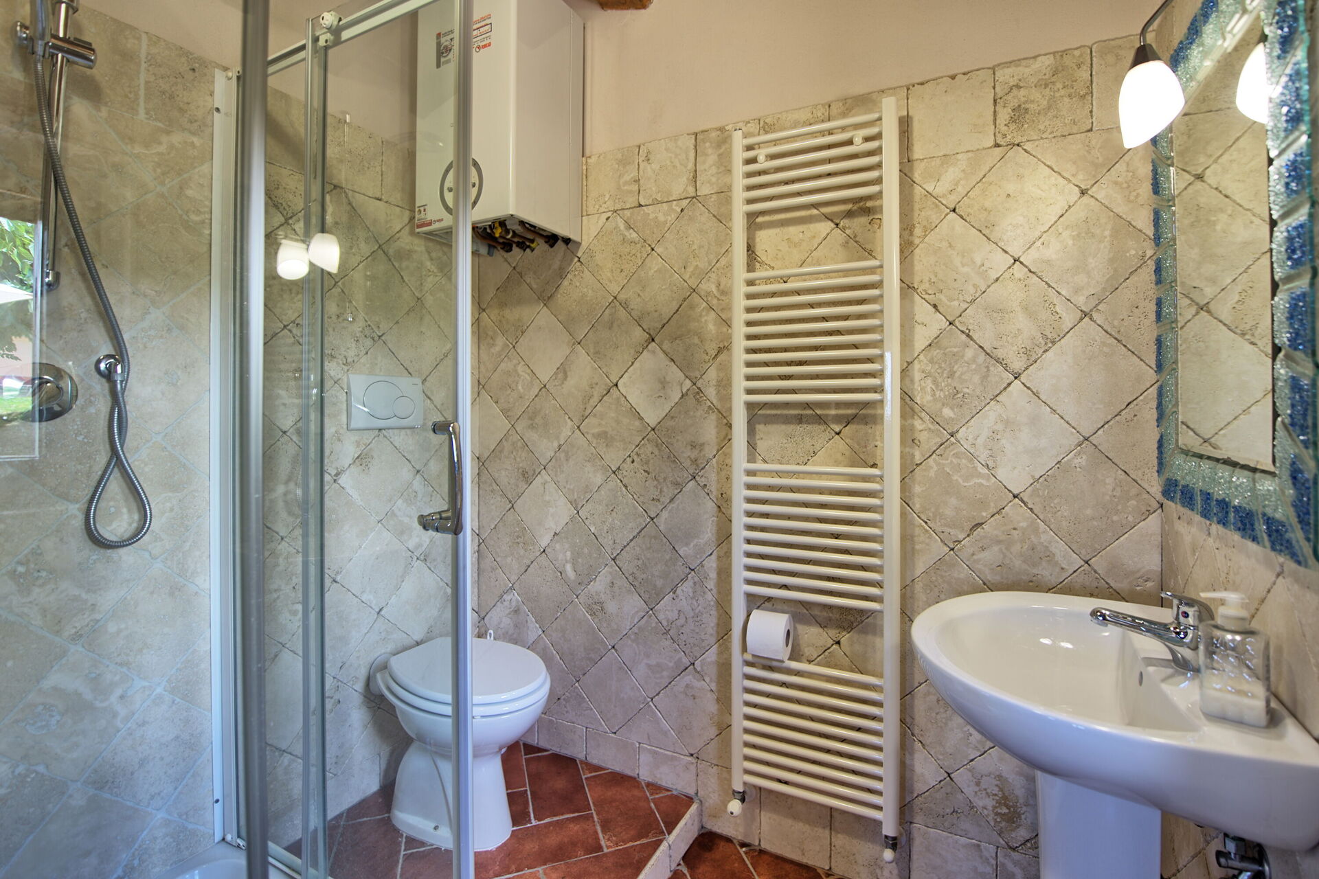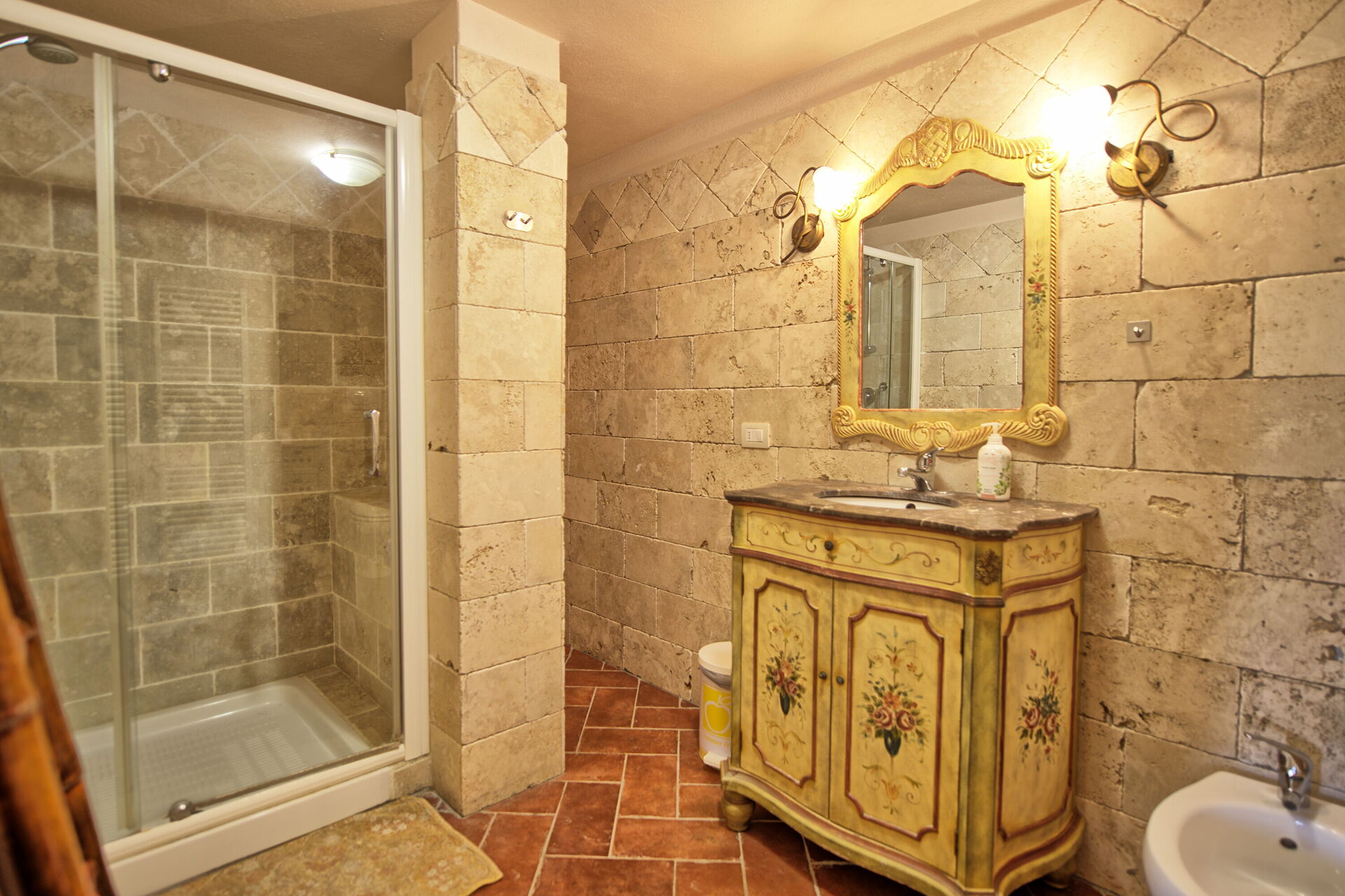 über typische Elemente der rustikalen toskanischen Landhäuser, wie Holzbalkendecken, Marmor, Terrakottaböden und Steinwände.