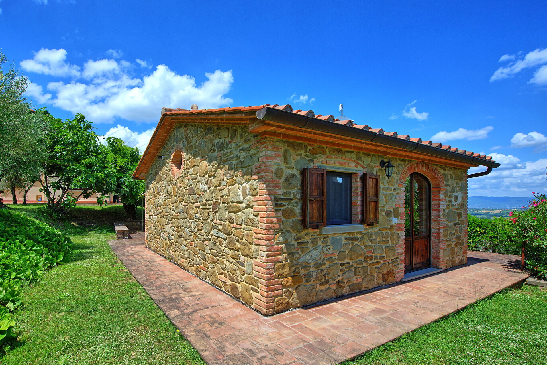 Im Aussenbereich ist die Villa von einem schönen gepflegten Garten voller Pflanzen und Blumen umgeben und bietet einen herrlichen Panoramablick auf die umliegenden Hügel und die typische Landschaft des Valdichiana. Das gleiche Panorama kann vom wunderschönen privaten Schwimmbad aus bewundert werden, das nur wenige Meter von den beiden Häusern entfernt ist und von einer
