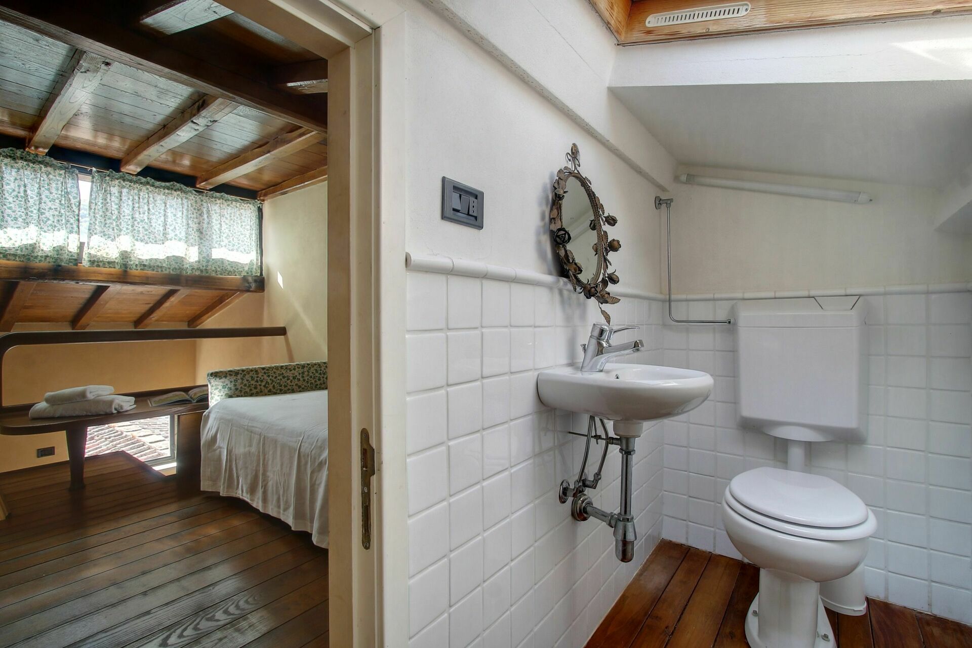Mansarde: Kleines Zimmer mit Einzelbett und kleinem WC mit Waschbecken.