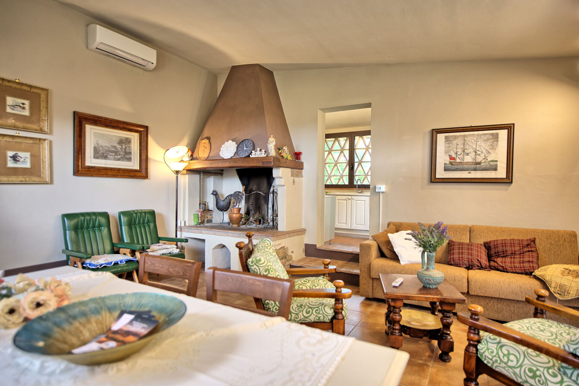 2 Stufen tiefer(von der Küche oder vom Doppelzimmer erreichbar): Wohnzimmer mit Sesseln (Klimaanlage und TV) mit Kamin, Essbereich und direkter Zugang nach draußen.