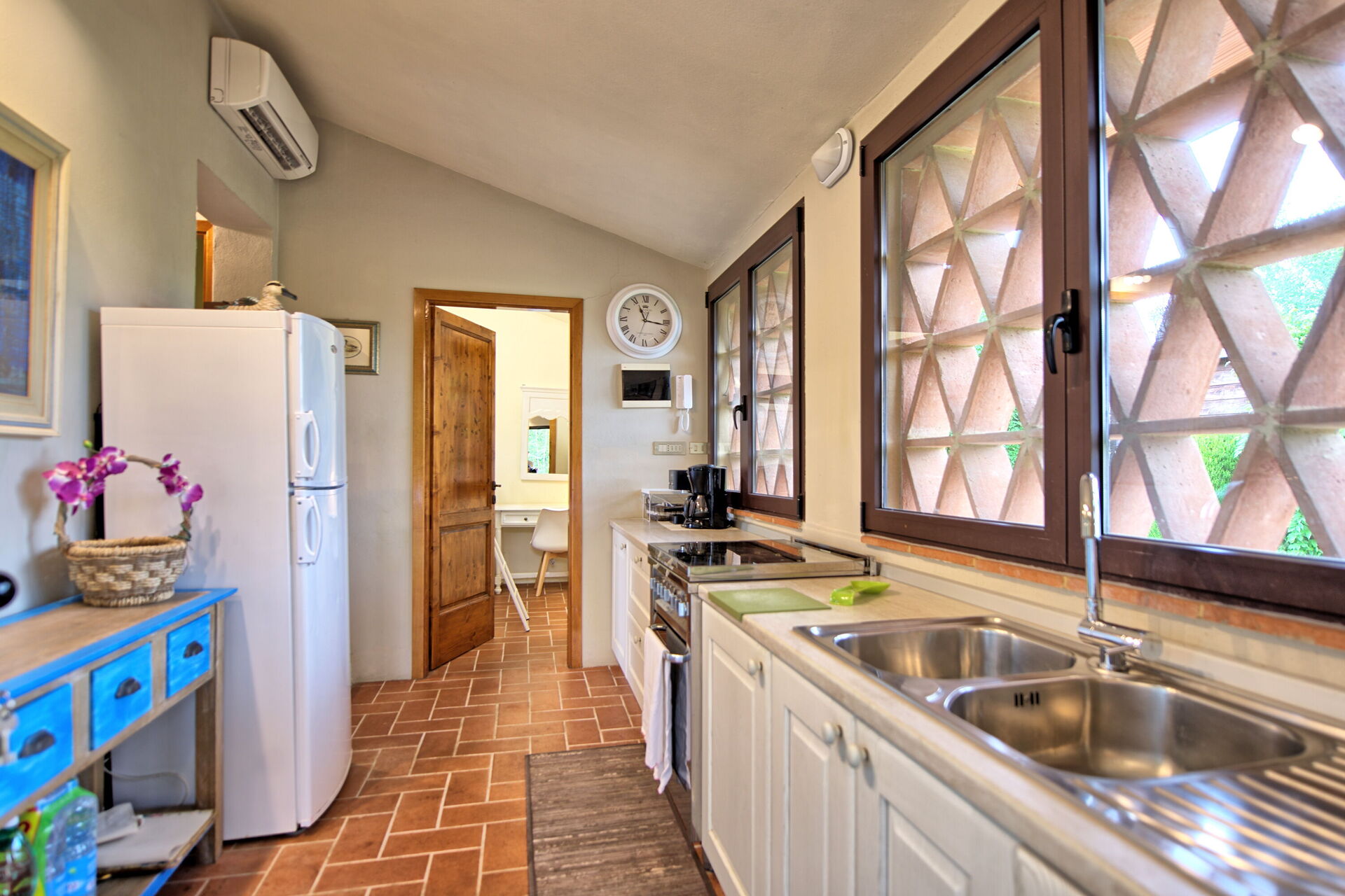 Erdgeschoss: Eingang zur Küche (Klimaanlage, Backofen, Gefrierschrank, Spülmaschiene) , Zimmer mit Etagenbett.