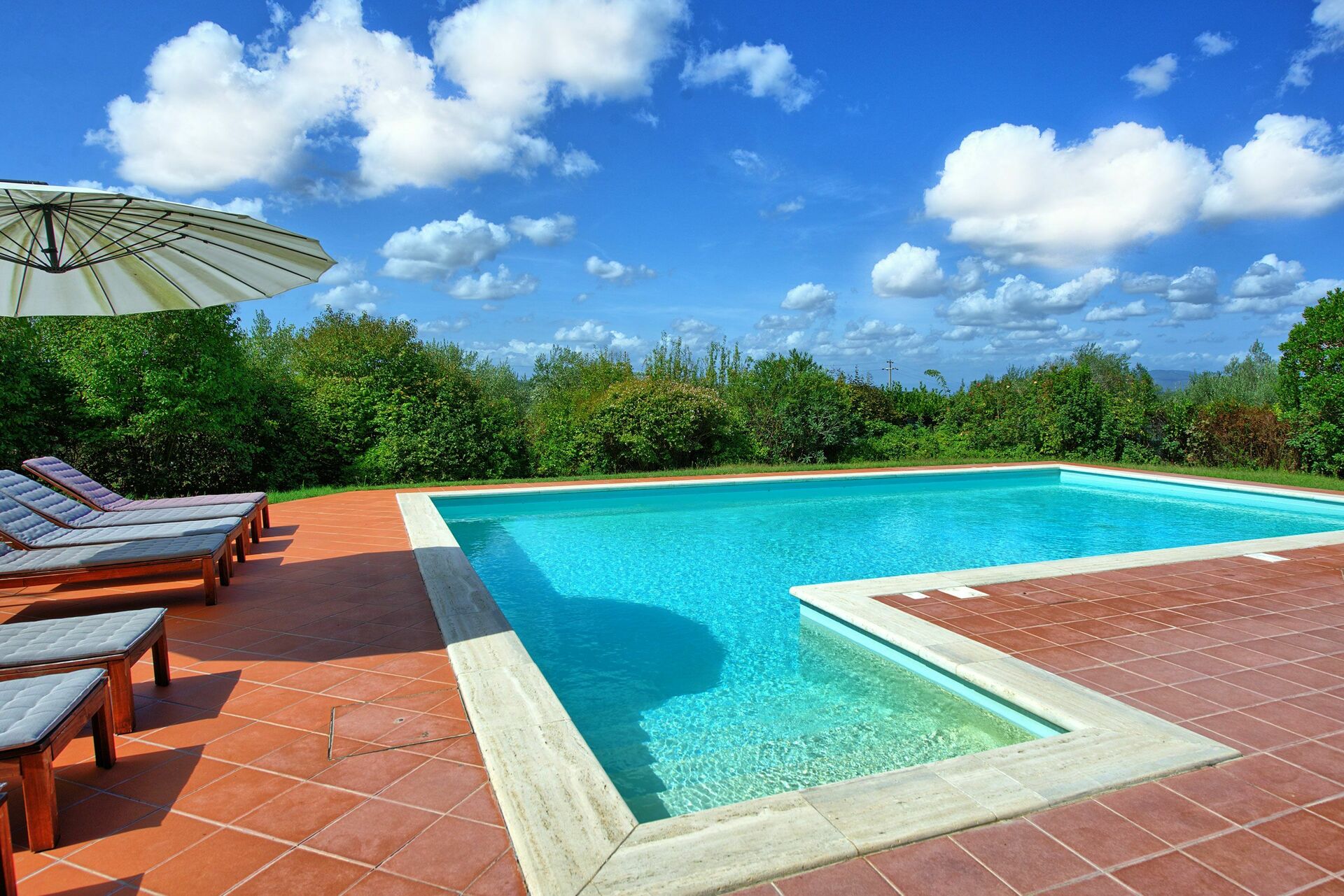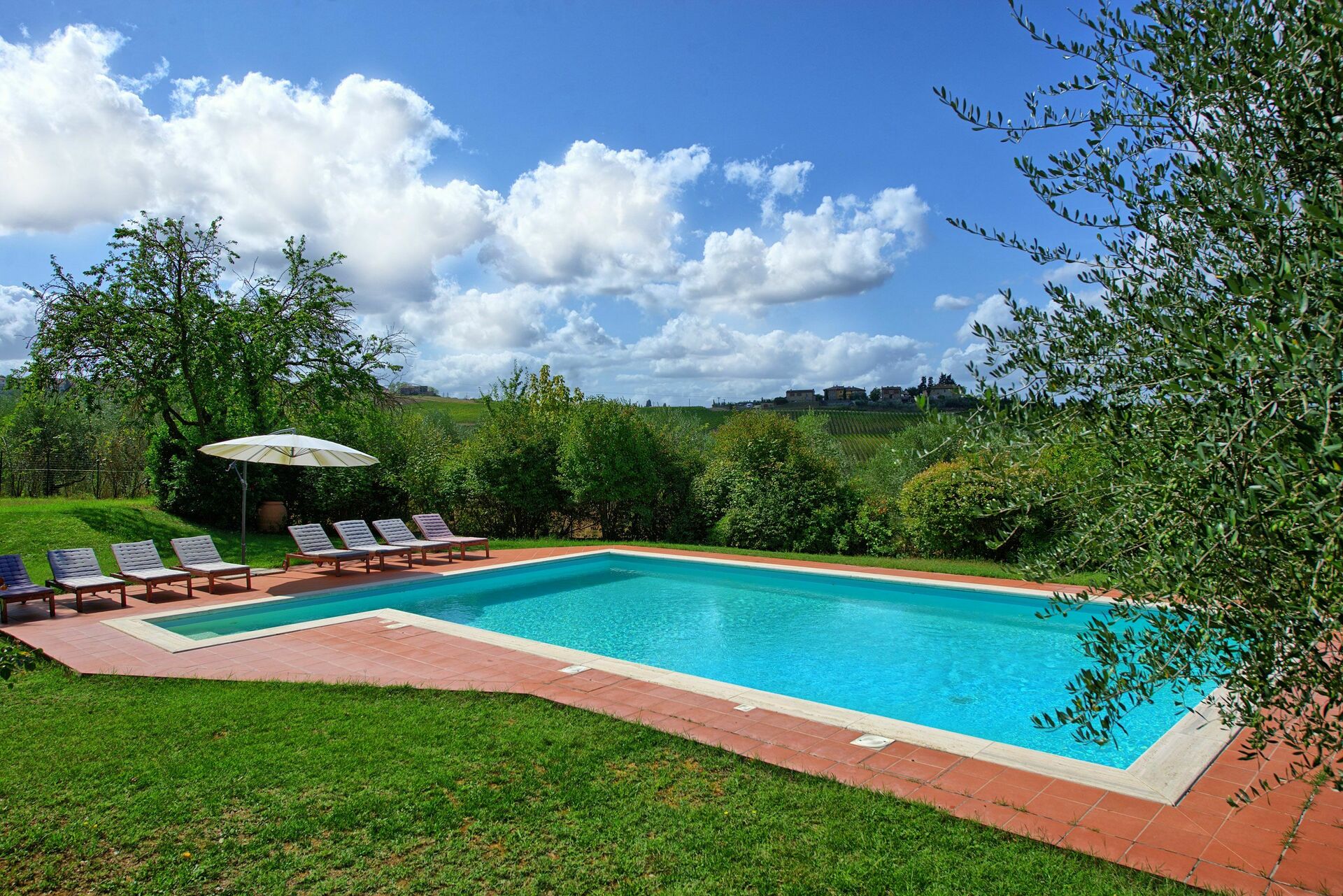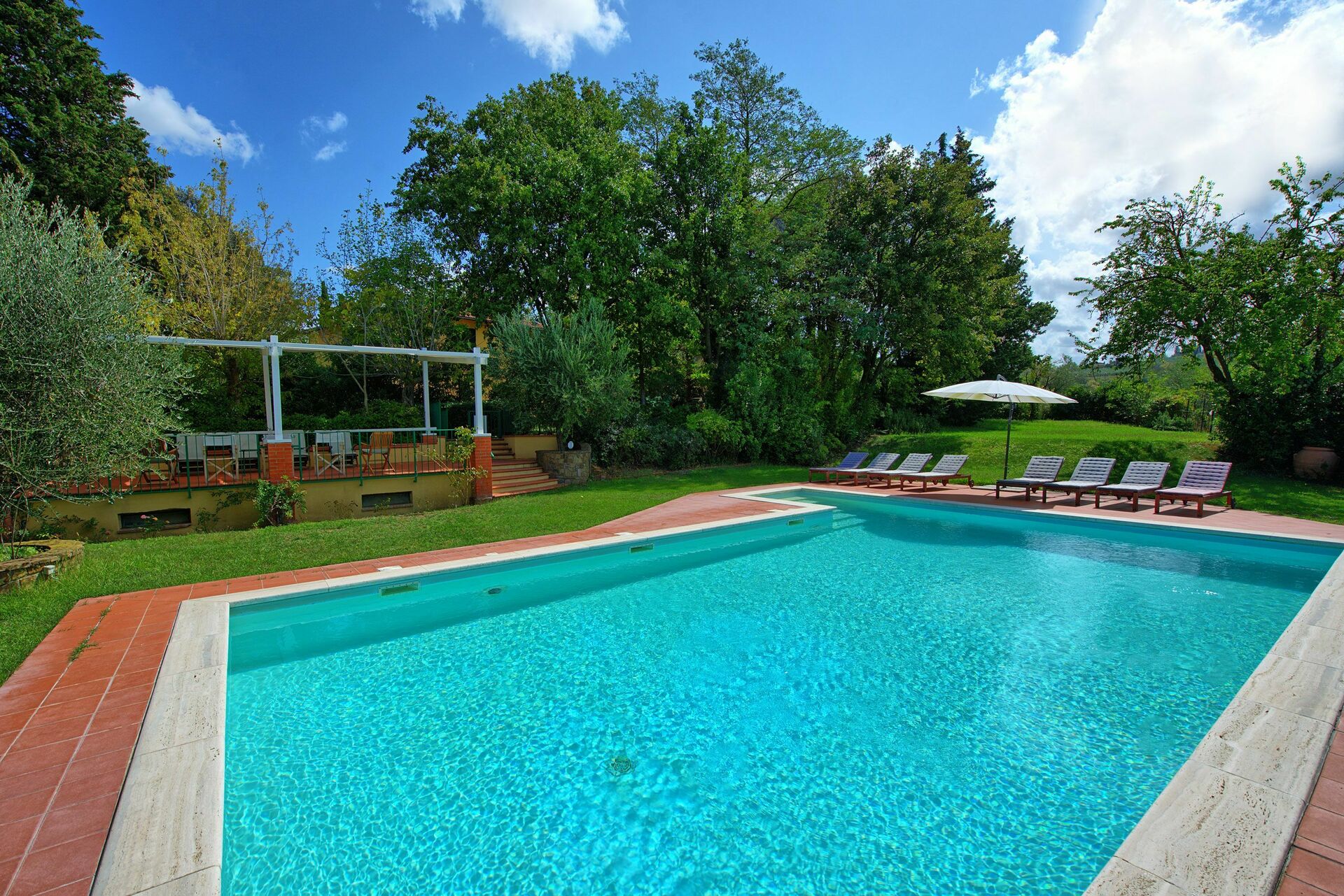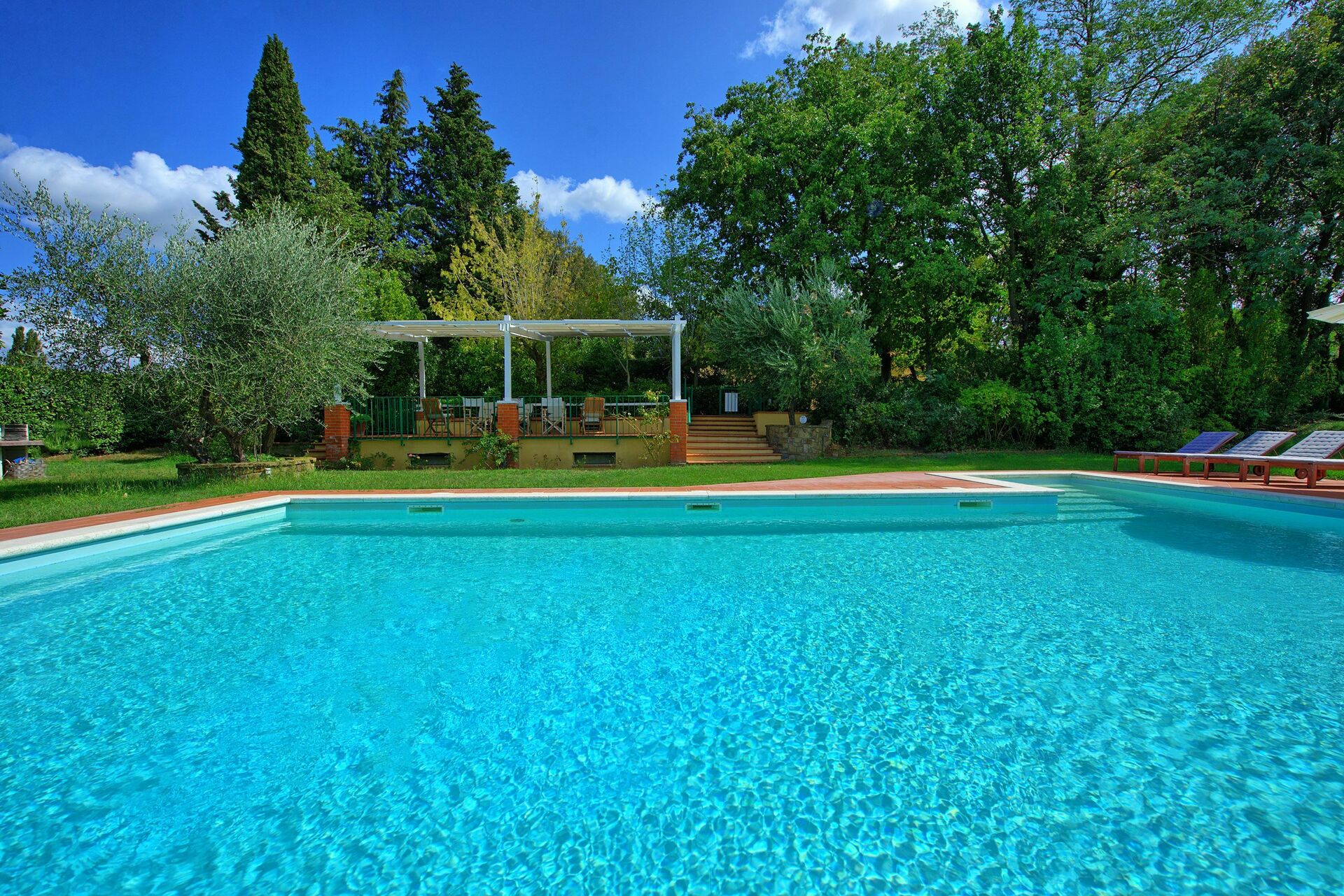 Im Aussenbereich ist das Haus von einem schönen Garten und überdachten Terrassen umgeben, die zum Aufenthalt im Freien ausgestattet sind, wobei man die wunderschöne Aussicht auf die Chianti-Hügel genießen kann. Ein paar Meter vom Haus entfernt können die Gäste ein wunderschönes privates Schwimmbad mit Panoramablick genießen, umgeben von einer Sonnenterrasse mit Liegestühlen und Sonnenschirmen. Der perfekte Ort, um sich an heißen Sommertagen zu entspannen und sich abzukühlen mit der Familie oder einer Gruppe von Freunden.