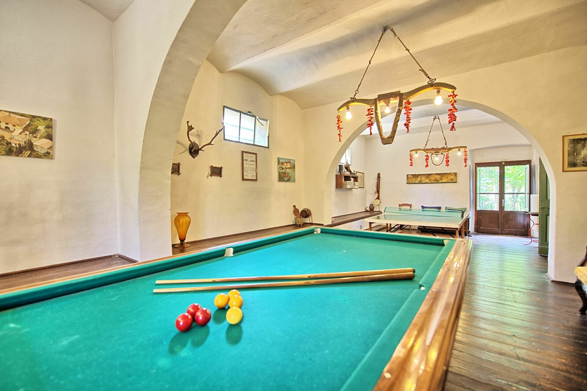 Die Ferienvilla, die sich über mehrere Etagen erstreckt, ist sehr groß und sehr schön eingerichtet mit traditionellen Materialien, die typisch für Landhäuser sind, in Kombination mit eleganten Antiquitäten. Die einladenden und hellen Innenräume sind mit allem Komfort ausgestattet, um den Gästen einen angenehmen und erholsamen Aufenthalt zu garantieren. Dank der 5 Schlafzimmer und der großzügigen Gemeinschaftsräume bietet die Villa Platz für bis zu 10 Personen. Den Gästen steht ein Saal zur Verfügung, der mit Tischtennis, Billard und Klavier ausgestattet ist.