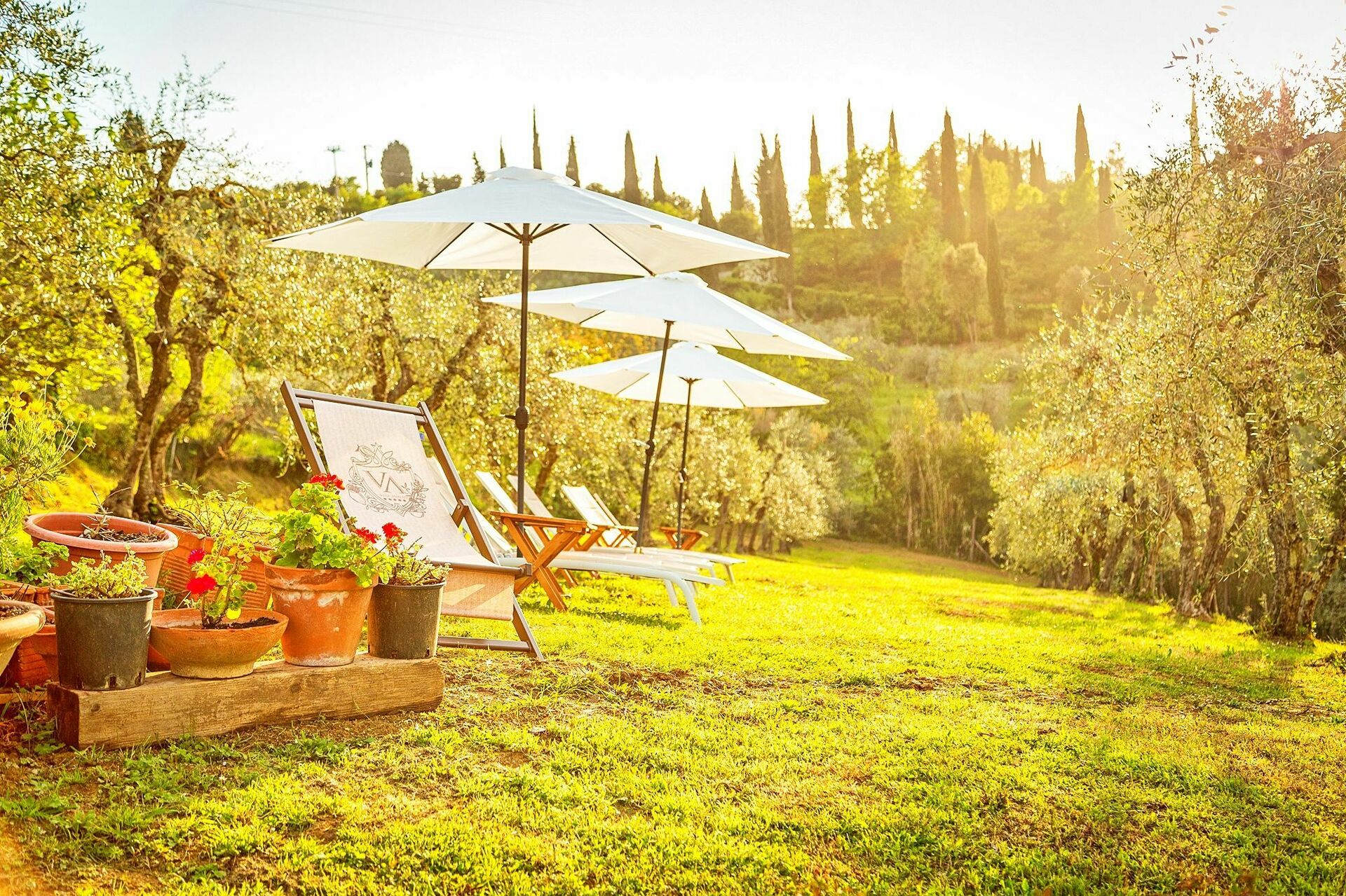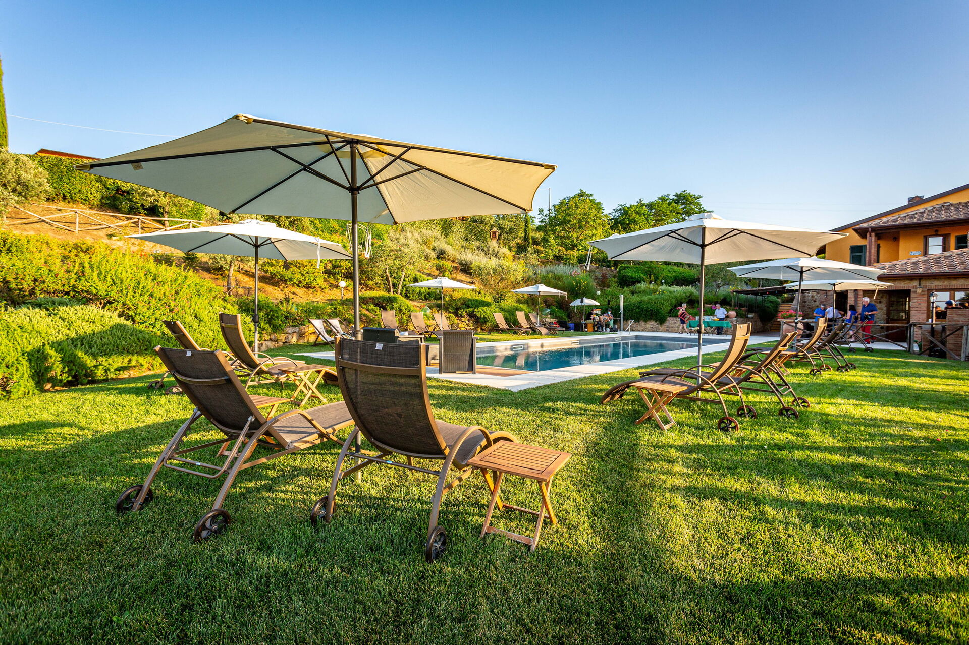 - Große, asugestattete Außenbereiche mit Sonnenschirmen und Liegestühlen