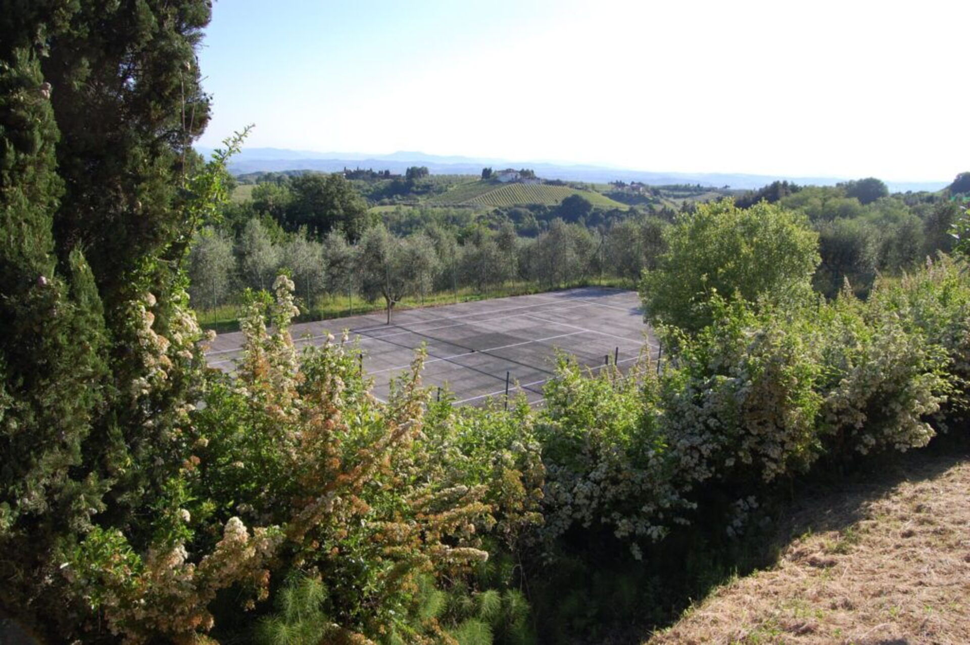 Den Gästen steht ein großzügiger Außenbereich mit einem Schwimmbad und einem Tennisplatz aus Zement zur Verfügung.