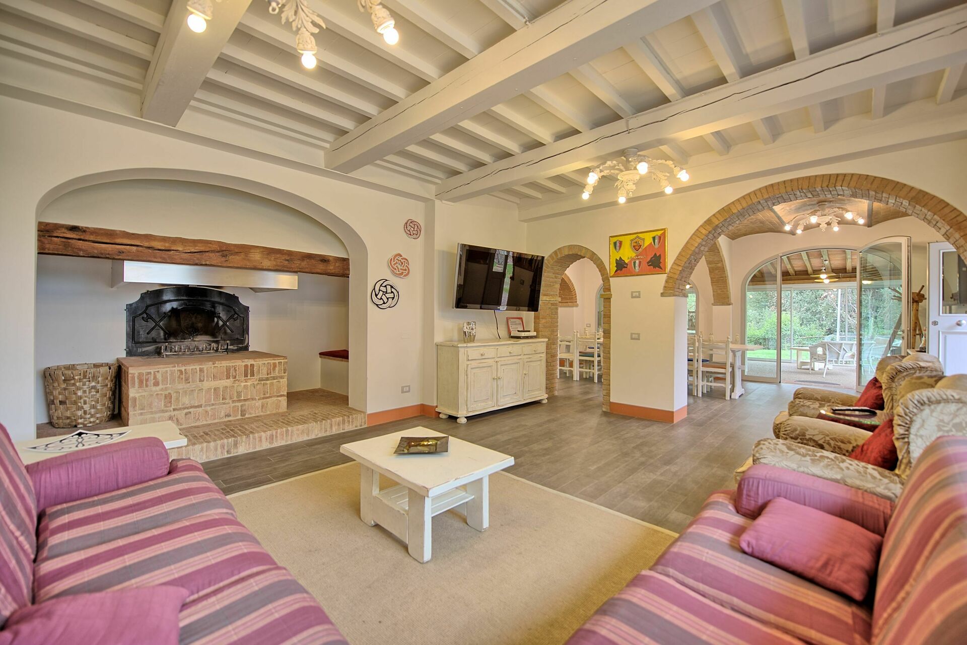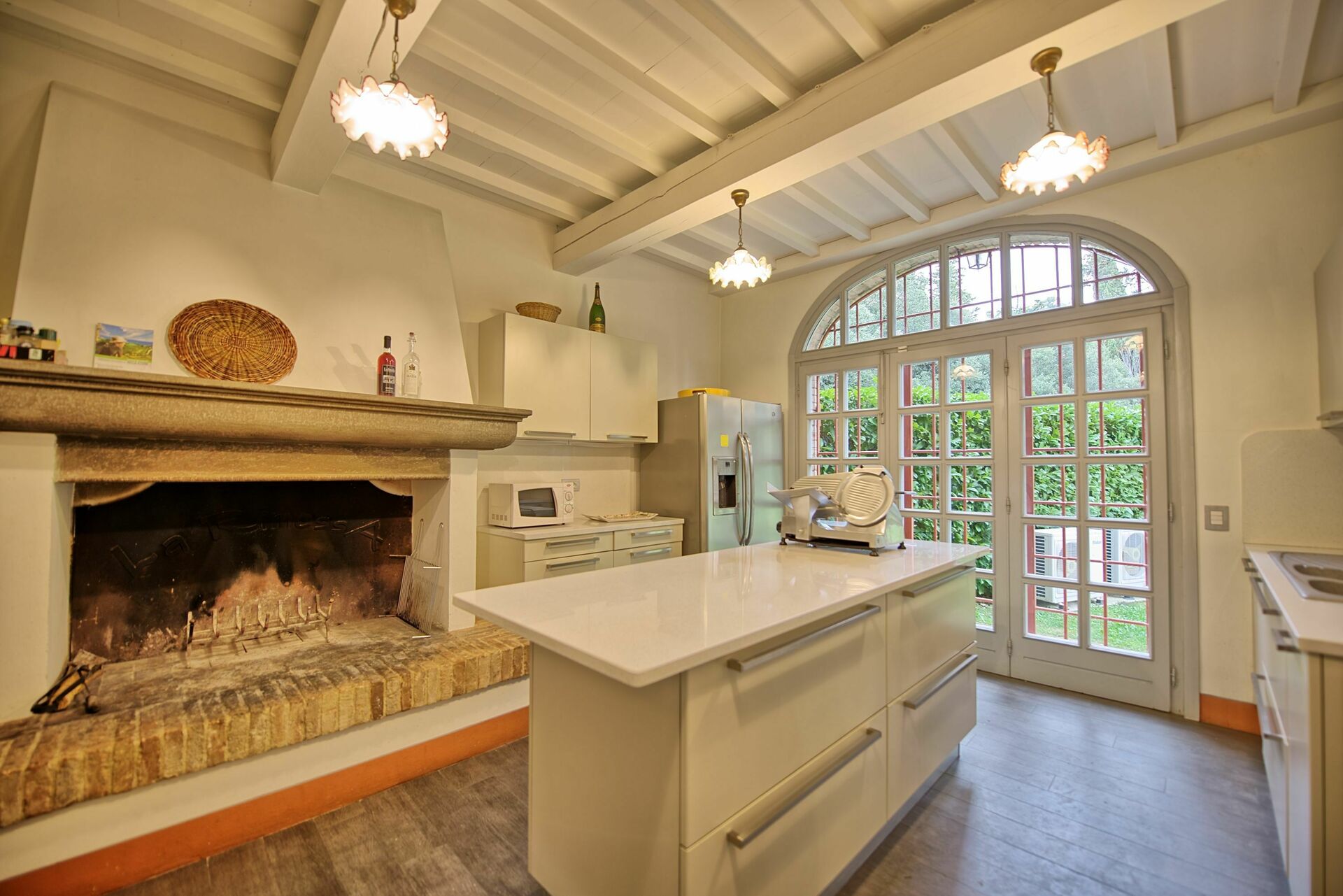 Erdgeschoss: Wohnzimmer mit Kamin und Essbereich in einem großen Raum mit Fensterfronten die direkten Blick auf den wunderschönen Garten bieten, WC, Küche (Mikrowelle, Backofen, Kühlschrank mit Eiswürfelproduktion, Espressomaschine) mit Kamin und Zugang nach draußen.