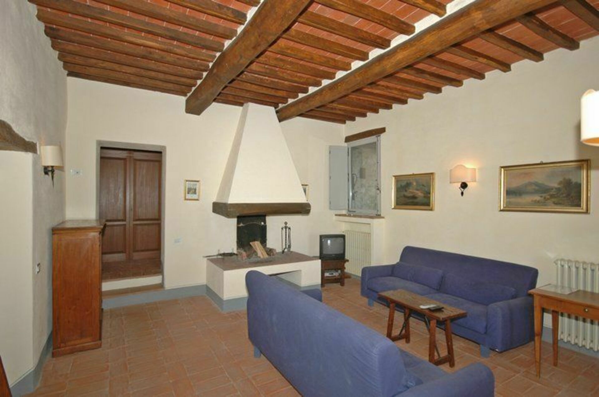 Erdgeschoss:Wohnzimmer (Sat-TV) mit großem Kamin, Ess- und Kochbereich (Gefrierfach, Ofen, Spülmaschine), mit Zugang zum Garten.
